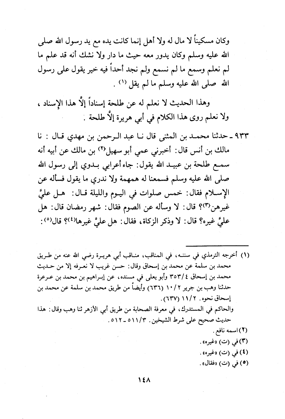 933 - حَدَّثَنَا مُحَمَّدُ بْنُ الْمُثَنَّى، قَالَ: نا عَبْدُ الرَّحْمَنِ بْنُ مَهْدِيٍّ، قَالَ: نا مَالِكُ بْنُ أَنَسٍ، قَالَ: أَخْبَرَنِي عَمِّي أَبُو سُهَيْلِ بْنُ مَالِكٍ، عَنْ أَبِيهِ، أَنَّهُ سَمِعَ طَلْحَةَ بْنَ عُبَيْدِ اللَّهِ، يَقُولُ: جَاءَ أَعْرَابِيٌّ بَدَوِيُّ إِلَى رَسُولِ اللَّهِ صَلَّى اللهُ عَلَيْهِ وَسَلَّمَ، فَسَمِعْنَا لَهُ هَمْهَمَةً وَلَا نَدْرِي مَا يَقُولُ فَسَأَلَهُ عَنِ الْإِسْلَامِ فَقَالَ: «§خَمْسُ صَلَوَاتٍ فِي الْيَوْمِ وَاللَّيْلَةِ» قَالَ: هَلْ عَلَيَّ غَيْرُهُنَّ؟ قَالَ: «لَا» وَسَأَلَهُ عَنِ الصَّوْمِ، فَقَالَ: «شَهْرُ رَمَضَانَ» قَالَ: هَلْ عَلَيَّ غَيْرُهُ؟ قَالَ: «لَا» وَذَكَرَ الزَّكَاةَ فَقَالَ: هَلْ عَلَيَّ غَيْرُهَا؟ قَالَ -[149]-: «لَا» قَالَ: وَالَّذِي بَعَثَكَ بِالْحَقِّ لَا أُزِيدُ عَلَيْهِنَّ وَلَا أُنْقِصُ فَقَالَ رَسُولُ اللَّهِ صَلَّى اللهُ عَلَيْهِ وَسَلَّمَ: «أَفْلَحَ إِنْ صَدَقَ» قَالَ أَبُو بَكْرٍ: وَلَا نَعْلَمُ رَوَى مَالِكُ بْنُ أَبِي عَامِرٍ، عَنْ طَلْحَةَ بْنِ عُبَيْدِ اللَّهِ، إِلَّا هَذَيْنِ الْحَدِيثَيْنِ وَلَا يُرْوَى هَذَا الْكَلَامُ عَنْ طَلْحَةَ إِلَّا بِهَذَا الْإِسْنَادِ، وَقَدْ رُوِيَ عَنْ أَنَسٍ عَنِ النَّبِيِّ صَلَّى اللهُ عَلَيْهِ وَسَلَّمَ