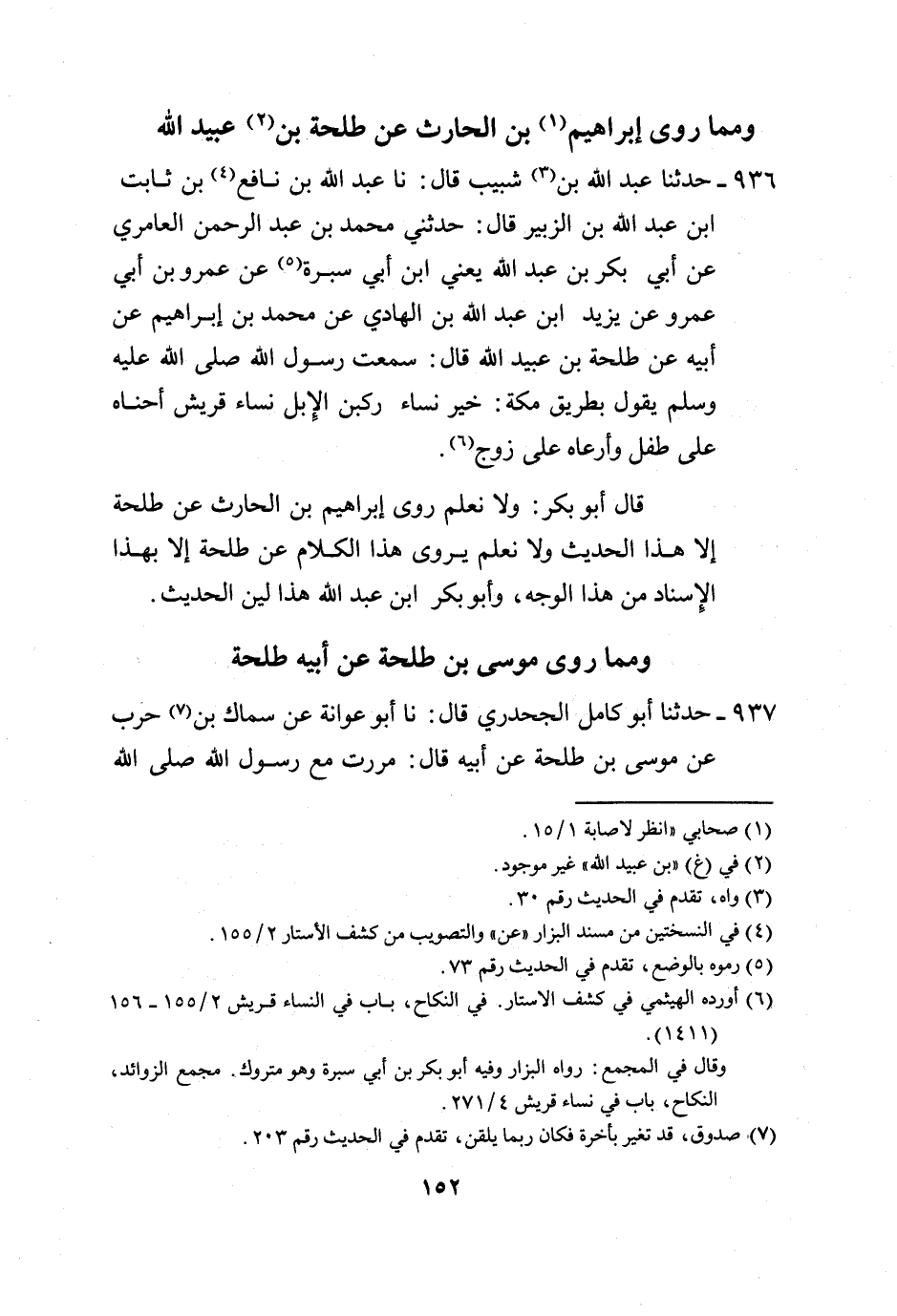 936 - حَدَّثَنَا عَبْدُ اللَّهِ بْنُ شَبِيبٍ، قَالَ: نا عَبْدُ اللَّهِ بْنُ نَافِعِ بْنِ ثَابِتِ بْنِ عَبْدِ اللَّهِ بْنِ الزُّبَيْرِ، قَالَ: حَدَّثَنِي مُحَمَّدُ بْنُ عَبْدِ الرَّحْمَنِ الْعَامِرِيُّ، عَنْ أَبِي بَكْرِ بْنِ عَبْدِ اللَّهِ يَعْنِي ابْنَ أَبِي سَبْرَةَ، عَنْ عَمْرِو بْنِ أَبِي عَمْرٍو، عَنْ يَزِيدَ بْنِ عَبْدِ اللَّهِ بْنِ الْهَادِي، عَنْ مُحَمَّدِ بْنِ إِبْرَاهِيمَ، عَنْ أَبِيهِ، عَنْ طَلْحَةَ بْنِ عُبَيْدِ اللَّهِ، قَالَ: سَمِعْتُ رَسُولَ اللَّهِ صَلَّى اللهُ عَلَيْهِ وَسَلَّمَ يَقُولُ بِطَرِيقِ مَكَّةَ: " §خَيْرُ نِسَاءٍ رَكَبْنَ الْإِبِلَ نِسَاءُ قُرَيْشٍ أَحْنَاهُ عَلَى طِفْلٍ وَأَرْعَاهُ عَلَى زَوْجٍ. قَالَ أَبُو بَكْرٍ: وَلَا نَعْلَمُ رَوَى إِبْرَاهِيمُ بْنُ الْحَارِثِ، عَنْ طَلْحَةَ إِلَّا هَذَا الْحَدِيثَ، وَلَا نَعْلَمُ يُرْوَى هَذَا الْكَلَامُ عَنْ طَلْحَةَ إِلَّا بِهَذَا الْإِسْنَادِ، مِنْ هَذَا الْوَجْهِ، وَأَبُو بَكْرِ بْنُ عَبْدِ اللَّهِ هَذَا لَيِّنُ الْحَدِيثِ
