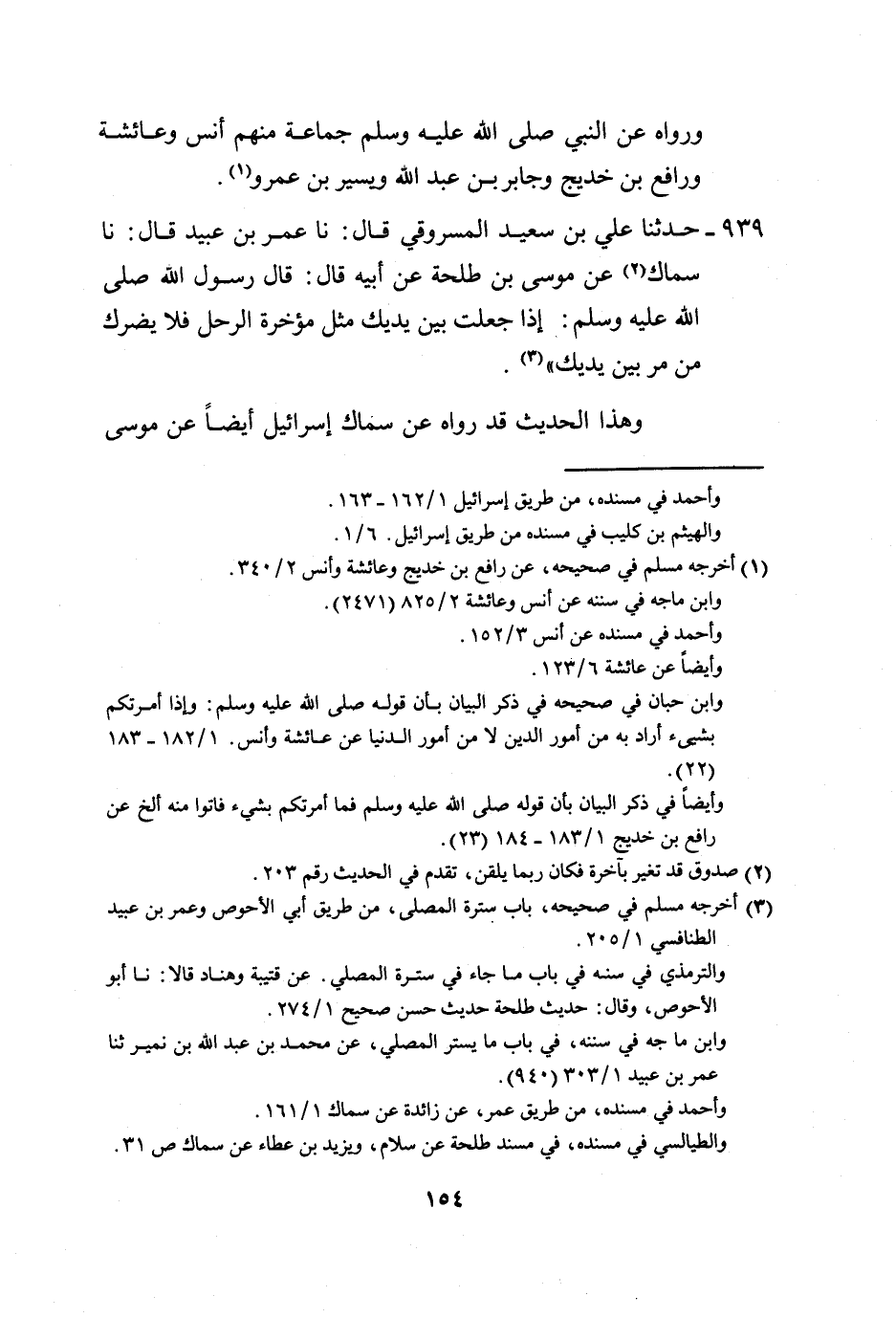939 - حَدَّثَنَا عَلِيُّ بْنُ سَعِيدٍ الْمَسْرُوقِيُّ، قَالَ: نا عُمَرُ بْنُ عُبَيْدٍ، قَالَ: نا سِمَاكٌ، عَنْ مُوسَى بْنِ طَلْحَةَ، عَنْ أَبِيهِ، قَالَ: قَالَ رَسُولُ اللَّهِ صَلَّى اللهُ عَلَيْهِ وَسَلَّمَ: " §إِذَا جَعَلْتَ بَيْنَ يَدَيْكَ مِثْلَ مُؤَخِّرَةِ الرَّحْلِ فَلَا يَضُرُّكَ مَنْ مَرَّ بَيْنَ يَدَيْكَ. وَهَذَا الْحَدِيثُ قَدْ رَوَاهُ عَنْ سِمَاكٍ إِسْرَائِيلُ أَيْضًا، عَنْ مُوسَى -[155]- بْنَ طَلْحَةُ، عَنْ أَبِيهِ، فَاقْتَصَرْنَا عَلَى عُمَرَ بْنِ عُبَيْدٍ. وَقَدْ رُوِيَ فِي هَذَا الْبَابِ عَنْ أَبِي ذَرٍّ، وَعَنْ أَبِي هُرَيْرَةَ، وَعَنْ أَنَسِ بْنِ مَالِكٍ، وَغَيْرِهِمْ