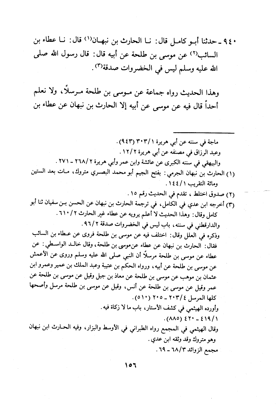940 - حَدَّثَنَا أَبُو كَامِلٍ، قَالَ: نا الْحَارِثُ بْنُ نَبْهَانَ، قَالَ: نا عَطَاءُ بْنُ السَّائِبِ، عَنْ مُوسَى بْنِ طَلْحَةَ، عَنْ أَبِيهِ، قَالَ: قَالَ رَسُولُ اللَّهِ صَلَّى اللهُ عَلَيْهِ وَسَلَّمَ: «§لَيْسَ فِي الْخُضْرَوَاتِ صَدَقَةٌ» وَهَذَا الْحَدِيثُ رَوَاهُ جَمَاعَةٌ عَنْ مُوسَى بْنِ طَلْحَةَ مُرْسَلًا، وَلَا نَعْلَمُ أَحَدًا، قَالَ: فِيهِ عَنْ مُوسَى عَنْ أَبِيهِ إِلَّا الْحَارِثَ بْنَ نَبْهَانَ، عَنْ عَطَاءِ بْنِ -[157]- السَّائِبِ، وَلَا نَعْلَمُ رَوَى عَطَاءٌ، عَنْ مُوسَى بْنِ طَلْحَةَ، عَنْ أَبِيهِ، إِلَّا هَذَا الْحَدِيثَ