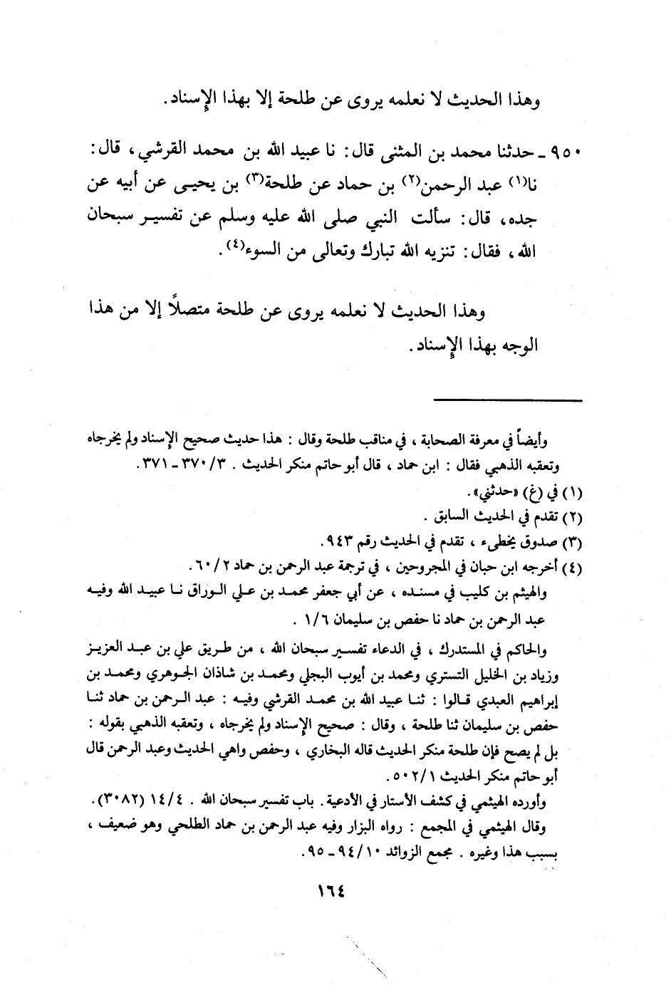 950 - حَدَّثَنَا مُحَمَّدُ بْنُ الْمُثَنَّى، قَالَ: نا عُبَيْدُ اللَّهِ بْنُ مُحَمَّدٍ الْقُرَشِيُّ، قَالَ: نا عَبْدُ الرَّحْمَنِ بْنُ حَمَّادٍ، عَنْ طَلْحَةَ بْنِ يَحْيَى، عَنْ أَبِيهِ، عَنْ جَدِّهِ، قَالَ: سَأَلْتُ النَّبِيَّ صَلَّى اللهُ عَلَيْهِ وَسَلَّمَ، عَنْ تَفْسِيرِ سُبْحَانَ اللَّهِ فَقَالَ: §تَنْزِيهُ اللَّهِ تَبَارَكَ وَتَعَالَى مِنَ السُّوءِ وَهَذَا الْحَدِيثُ لَا نَعْلَمُهُ يُرْوَى عَنْ طَلْحَةَ، مُتَّصِلًا إِلَّا مِنْ هَذَا الْوَجْهِ بِهَذَا الْإِسْنَادِ