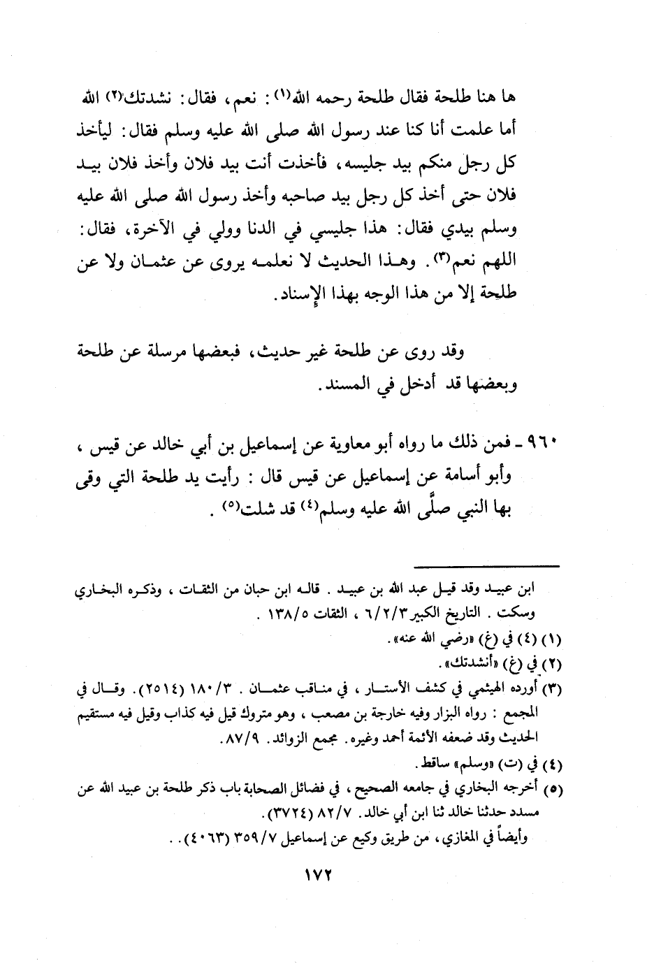 960 - فَمِنْ ذَلِكَ مَا رَوَاهُ أَبُو مُعَاوِيَةَ، عَنْ إِسْمَاعِيلَ بْنِ أَبِي خَالِدٍ، عَنْ قَيْسٍ، وَأَبُو أُسَامَةَ، عَنْ إِسْمَاعِيلَ، عَنْ قَيْسٍ، قَالَ: رَأَيْتُ يَدَ طَلْحَةَ الَّتِي وَقَى بِهَا النَّبِيَّ صَلَّى اللهُ عَلَيْهِ وَسَلَّمَ قَدْ شُلَّتْ "