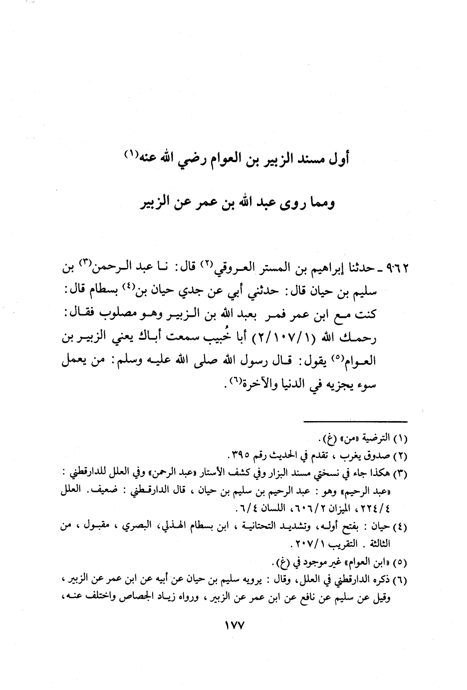 962 - حَدَّثَنَا إِبْرَاهِيمُ بْنُ الْمُسْتَمِرِّ الْعُرُوقِيُّ، قَالَ: نا عَبْدُ الرَّحْمَنِ بْنُ سُلَيْمِ بْنِ حَيَّانَ، قَالَ حَدَّثَنِي أَبِي، عَنْ جَدِّي حَيَّانَ بْنِ بِسْطَامٍ، قَالَ: كُنْتُ مَعَ ابْنِ عُمَرَ فَمَرَّ بعَبْدِ اللَّهِ بْنِ الزُّبَيْرِ وَهُوَ مَصْلُوبٌ فَقَالَ: رَحِمَكَ اللَّهُ أَبَا خُبَيْبٍ سَمِعْتُ أَبَاكَ يَعْنِي الزُّبَيْرَ بْنَ الْعَوَّامِ، يَقُولُ: قَالَ رَسُولُ اللَّهِ صَلَّى اللهُ عَلَيْهِ وَسَلَّمَ: «§مَنْ يَعْمَلْ سُوءًا يُجْزَ بِهِ فِي الدُّنْيَا وَالْآخِرَةِ» -[178]-. وَهَذَا الْحَدِيثُ لَا نَعْلَمُهُ يُرْوَى عَنِ الزُّبَيْرِ، إِلَّا مِنْ هَذَا الْوَجْهِ بِهَذَا الْإِسْنَادِ، وَلَا نَعْلَمُ رَوَى ابْنُ عُمَرَ، عَنِ الزُّبَيْرِ إِلَّا هَذَا الْحَدِيثَ