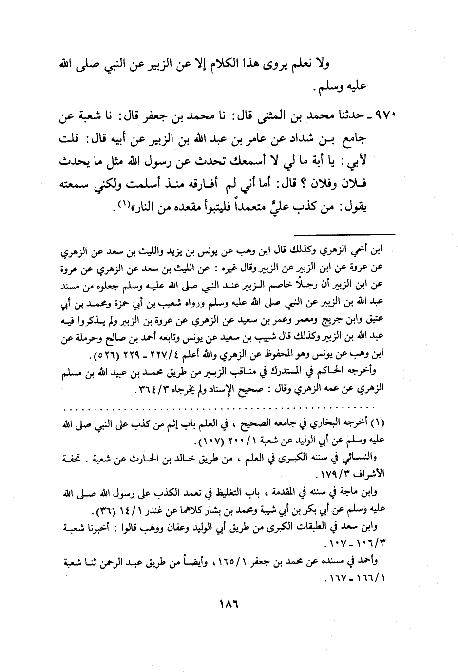 970 - حَدَّثَنَا مُحَمَّدُ بْنُ الْمُثَنَّى، قَالَ: نا مُحَمَّدُ بْنُ جَعْفَرٍ، قَالَ: نا شُعْبَةُ، عَنْ جَامِعِ بْنِ شَدَّادٍ، عَنْ عَامِرِ بْنِ عَبْدِ اللَّهِ بْنِ الزُّبَيْرِ، عَنْ أَبِيهِ، قَالَ: قُلْتُ لِأَبِي: يَا أَبَةَ مَالِي لَا أَسْمَعُكَ تُحَدِّثُ عَنْ رَسُولِ اللَّهِ مِثْلَ مَا يُحَدِّثُ فُلَانٌ وَفُلَانٌ قَالَ: أَمَا أَنِّي لَمْ أُفَارِقْهُ مُنْذُ أَسْلَمْتُ وَلَكِنِّي سَمِعْتُهُ يَقُولُ: «§مَنْ كَذَبَ عَلَيَّ مُتَعَمِّدًا فَلْيَتَبَوَّأْ مَقْعَدَهُ مِنَ النَّارِ»