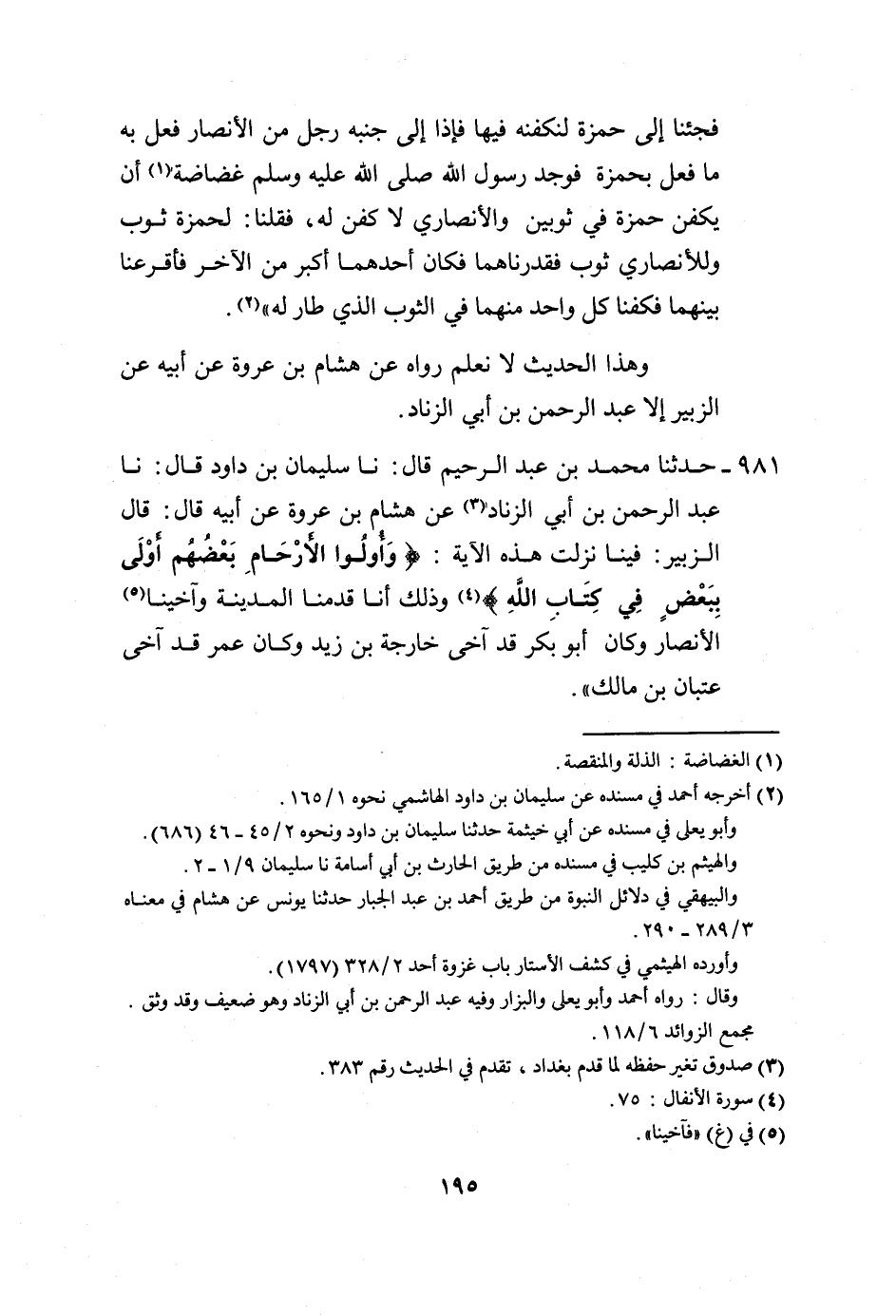 981 - حَدَّثَنَا مُحَمَّدُ بْنُ عَبْدِ الرَّحِيمِ، قَالَ نا سُلَيْمَانُ بْنُ دَاوُدَ، قَالَ نا عَبْدُ الرَّحْمَنِ بْنُ أَبِي الزِّنَادِ، عَنْ هِشَامِ بْنِ عُرْوَةَ، عَنْ أَبِيهِ، قَالَ: قَالَ الزُّبَيْرُ فِينَا نَزَلَتْ هَذِهِ الْآيَةُ: {§وَأُولُو الْأَرْحَامِ بَعْضُهُمْ أَوْلَى بِبَعْضٍ فِي كِتَابِ اللَّهِ} [الأحزاب: 6] وَذَلِكَ أَنَّا قَدِمْنَا الْمَدِينَةَ، وَآخَيْنَا الْأَنْصَارَ وَكَانَ أَبُو بَكْرٍ، قَدْ آخَى خَارِجَةَ بْنَ زَيْدٍ، وَكَانَ عُمَرُ قَدْ آخَى عِتْبَانَ بْنَ مَالِكٍ -[196]- وَهَذَا الْحَدِيثُ لَا نَعْلَمُ رَوَاهُ عَنْ هِشَامِ بْنِ عُرْوَةَ، عَنْ أَبِيهِ، إِلَّا ابْنُ أَبِي الزِّنَادِ