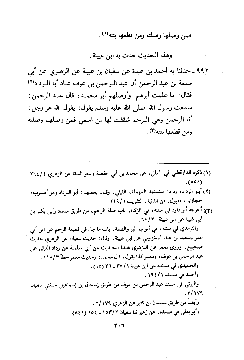992 - حَدَّثَنَا بِهِ أَحْمَدُ بْنُ عَبْدَةَ، عَنْ سُفْيَانَ بْنِ عُيَيْنَةَ، عَنِ الزُّهْرِيِّ، عَنْ أَبِي سَلَمَةَ بْنِ عَبْدِ الرَّحْمَنِ، أَنَّ عَبْدَ الرَّحْمَنِ بْنَ عَوْفٍ، عَادَ أَبَا الرَّدَّادِ فَقَالَ: مَا عَلِمْتُ أَبَرُّهُمْ وَأَوْصَلُهُمْ أَبُو مُحَمَّدٍ؟ قَالَ عَبْدُ الرَّحْمَنِ: سَمِعْتُ رَسُولَ اللَّهِ صَلَّى اللهُ عَلَيْهِ وَسَلَّمَ يَقُولُ: " §يَقُولُ اللَّهُ عَزَّ وَجَلَّ: أَنَا الرَّحْمَنُ وَهِيَ الرَّحِمُ شَقَقْتُ لَهَا مِنَ اسْمِي فَمَنْ وَصَلَهَا وَصَلْتُهُ وَمَنْ قَطَعَهَا بَتَتُّهُ " -[207]- وَقَدْ رَوَى هَذَا الْحَدِيثَ سُفْيَانُ بْنُ حُسَيْنٍ عَنِ الزُّهْرِيِّ، عَنْ إِبْرَاهِيمَ بْنِ عَبْدِ الرَّحْمَنِ بْنِ عَوْفٍ عَنْ أَبِيهِ. وَالصَّوَابُ مَا رَوَاهُ ابْنُ عُيَيْنَةَ عَنِ الزُّهْرِيِّ عَنْ أَبِي سَلَمَةَ، وَقَدْ رُوِيَ هَذَا الْكَلَامُ عَنِ النَّبِيِّ صَلَّى اللهُ عَلَيْهِ وَسَلَّمَ مِنْ وُجُوهٍ فَرَوَى ذَلِكَ أَبُو هُرَيْرَةَ، وَعَائِشَةُ، وَعَبْدُ اللَّهِ بْنُ عَمْرٍو بِكَلَامٍ يُشْبِهُ هَذَا