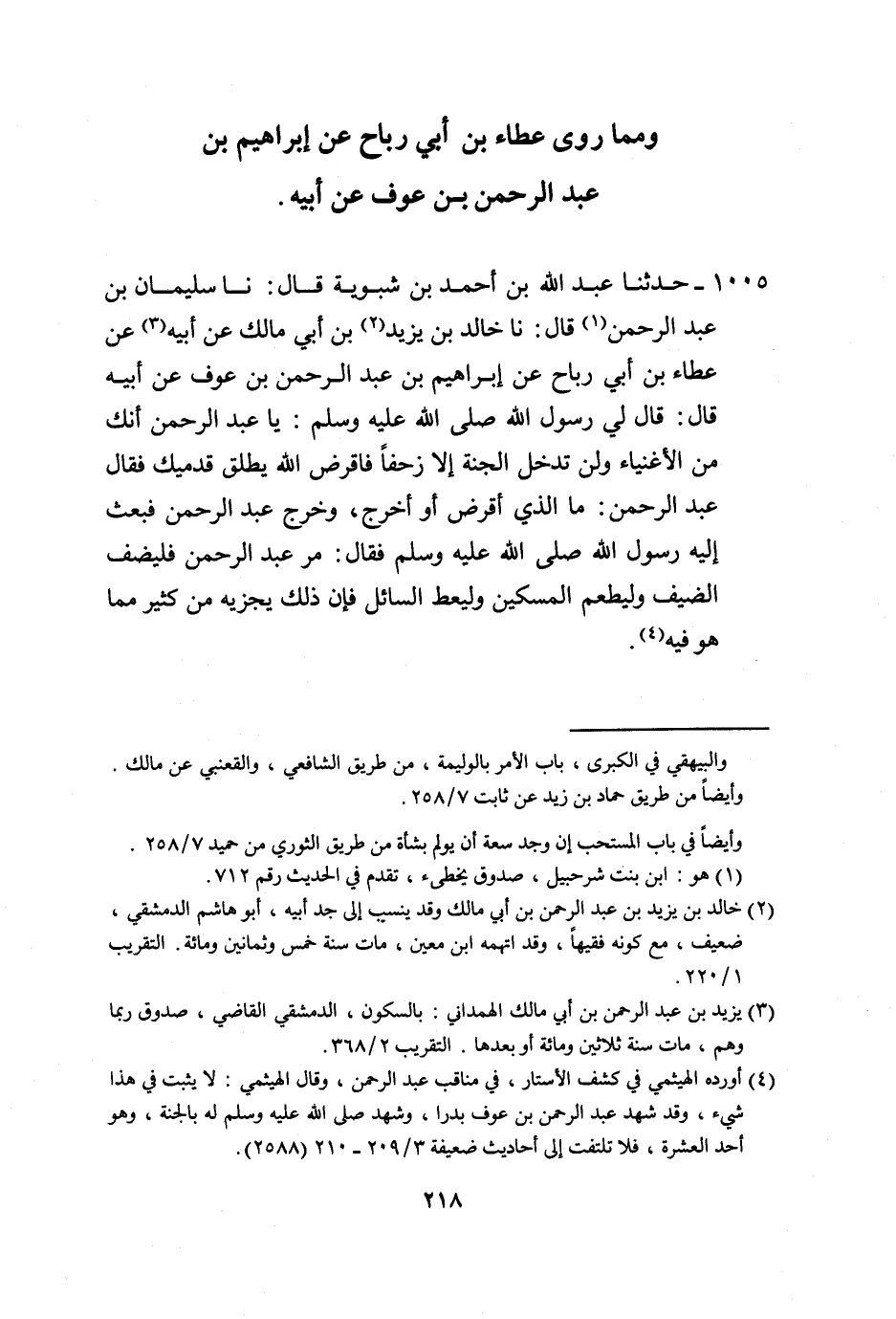 1005 - حَدَّثَنَا عَبْدُ اللَّهِ بْنُ أَحْمَدَ بْنِ شَبَّوَيْهِ، قَالَ نا سُلَيْمَانُ بْنُ عَبْدِ الرَّحْمَنِ، قَالَ: نا خَالِدُ بْنُ يَزِيدَ بْنِ أَبِي مَالِكٍ، عَنْ أَبِيهِ، عَنْ عَطَاءِ بْنِ أَبِي رَبَاحٍ، عَنْ إِبْرَاهِيمَ بْنِ عَبْدِ الرَّحْمَنِ بْنِ عَوْفٍ، عَنْ أَبِيهِ، قَالَ: قَالَ لِي رَسُولُ اللَّهِ صَلَّى اللهُ عَلَيْهِ وَسَلَّمَ: «يَا عَبْدَ الرَّحْمَنِ إِنَّكَ مِنَ الْأَغْنِيَاءِ وَلَنْ تَدْخُلَ الْجَنَّةَ إِلَّا زَحْفًا فَأَقْرِضِ اللَّهَ يُطْلِقْ قَدَمَيْكَ» فَقَالَ عَبْدُ الرَّحْمَنِ: مَا الَّذِي أُقْرِضُ أَوْ أُخْرِجُ وَخَرَجَ عَبْدُ الرَّحْمَنِ، فَبَعَثَ إِلَيْهِ رَسُولُ اللَّهِ صَلَّى اللهُ عَلَيْهِ وَسَلَّمَ، فَقَالَ: مُرْ عَبْدَ الرَّحْمَنِ §فَلْيُضِفِ الضَّيْفَ وَلْيُطْعِمِ الْمِسْكِينَ وَلْيُعْطِ السَّائِلَ فَإِنَّ ذَلِكَ يُجْزِيهِ مِنْ كَثِيرٍ مِمَّا هُوَ فِيهِ " -[219]- وَلَا نَعْلَمُ رَوَى عَطَاءُ بْنُ أَبِي رَبَاحٍ، عَنْ إِبْرَاهِيمَ بْنِ عَبْدِ الرَّحْمَنِ، عَنْ أَبِيهِ إِلَّا هَذَا الْحَدِيثَ