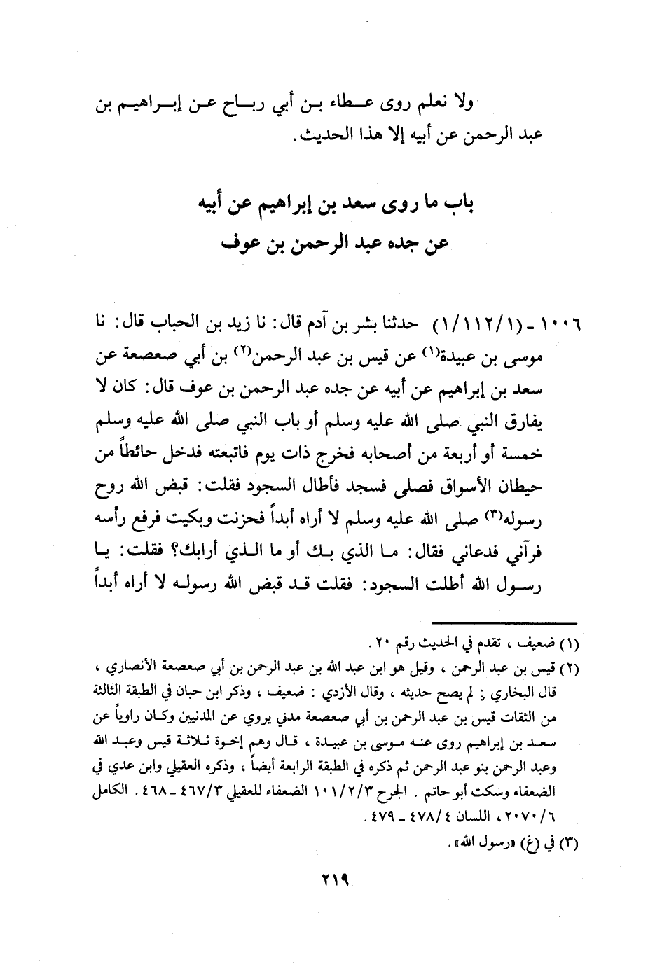 1006 - حَدَّثَنَا بِشْرُ بْنُ آدَمَ، قَالَ: نا زَيْدُ بْنُ الْحُبَابِ، قَالَ نا مُوسَى بْنُ عُبَيْدَةَ، عَنْ قَيْسِ بْنِ عَبْدِ الرَّحْمَنِ بْنِ أَبِي صَعْصَعَةَ، عَنْ سَعْدِ بْنِ إِبْرَاهِيمَ، عَنْ أَبِيهِ، عَنْ جَدِّهِ عَبْدِ الرَّحْمَنِ بْنِ عَوْفٍ، قَالَ: كَانَ لَا يُفَارِقُ النَّبِيَّ صَلَّى اللهُ عَلَيْهِ وَسَلَّمَ، أَوْ بَابَ النَّبِيِّ صَلَّى اللهُ عَلَيْهِ وَسَلَّمَ، خَمْسَةٌ أَوْ أَرْبَعَةٌ مِنْ أَصْحَابِهِ فَخَرَجَ ذَاتَ يَوْمٍ فَاتَّبَعْتُهُ فَدَخَلَ حَائِطًا مِنْ حِيطَانِ الْأَسْوَاقِ فَصَلَّى فَسَجَدَ فَأَطَالَ السُّجُودَ فَقُلْتُ: قَبَضَ اللَّهُ رَوْحَ رَسُولِهِ صَلَّى اللهُ عَلَيْهِ وَسَلَّمَ، لَا أُرَاهُ أَبَدًا فَحَزَنْتُ وَبَكَيْتُ فَرَفَعَ رَأْسَهُ فَرَآنِي فَدَعَانِي فَقَالَ: مَا الَّذِي بِكَ أَوْ مَا الَّذِي أَرَابَكَ فَقُلْتُ يَا رَسُولَ اللَّهِ: أَطَلْتَ السُّجُودَ فَقُلْتُ قَدْ قَبَضَ اللَّهُ رَسُولَهُ لَا أَرَاهُ أَبَدًا -[220]- فَحَزَنْتُ وَبَكَيْتُ قَالَ: سَجَدْتُ هَذِهِ السَّجْدَةَ شُكْرًا لِرَبِّي فِيمَا أَبْلَانِي فِي أُمَّتِي ثُمَّ إِنَّهُ قَالَ: §مَنْ صَلَّى عَلَيْكَ مِنْهُمْ صَلَاةً كَتَبْتُ لَهُ عَشْرَ حَسَنَاتٍ. وَهَذَا الْحَدِيثُ لَا نَعْلَمُ رَوَاهُ عَنْ سَعْدِ بْنِ إِبْرَاهِيمَ إِلَّا قَيْسُ بْنُ عَبْدِ الرَّحْمَنِ بْنِ أَبِي صَعْصَعَةَ، وَلَا رَوَاهُ عَنْ قَيْسٍ إِلَّا مُوسَى بْنُ عُبَيْدَةَ، وَقَدْ رُوِيَ عَنْ عَبْدِ الرَّحْمَنِ بْنِ عَوْفٍ مِنْ وَجْهٍ آخَرٍ غَيْرِ مُتَّصِلٍ عَنْهُ