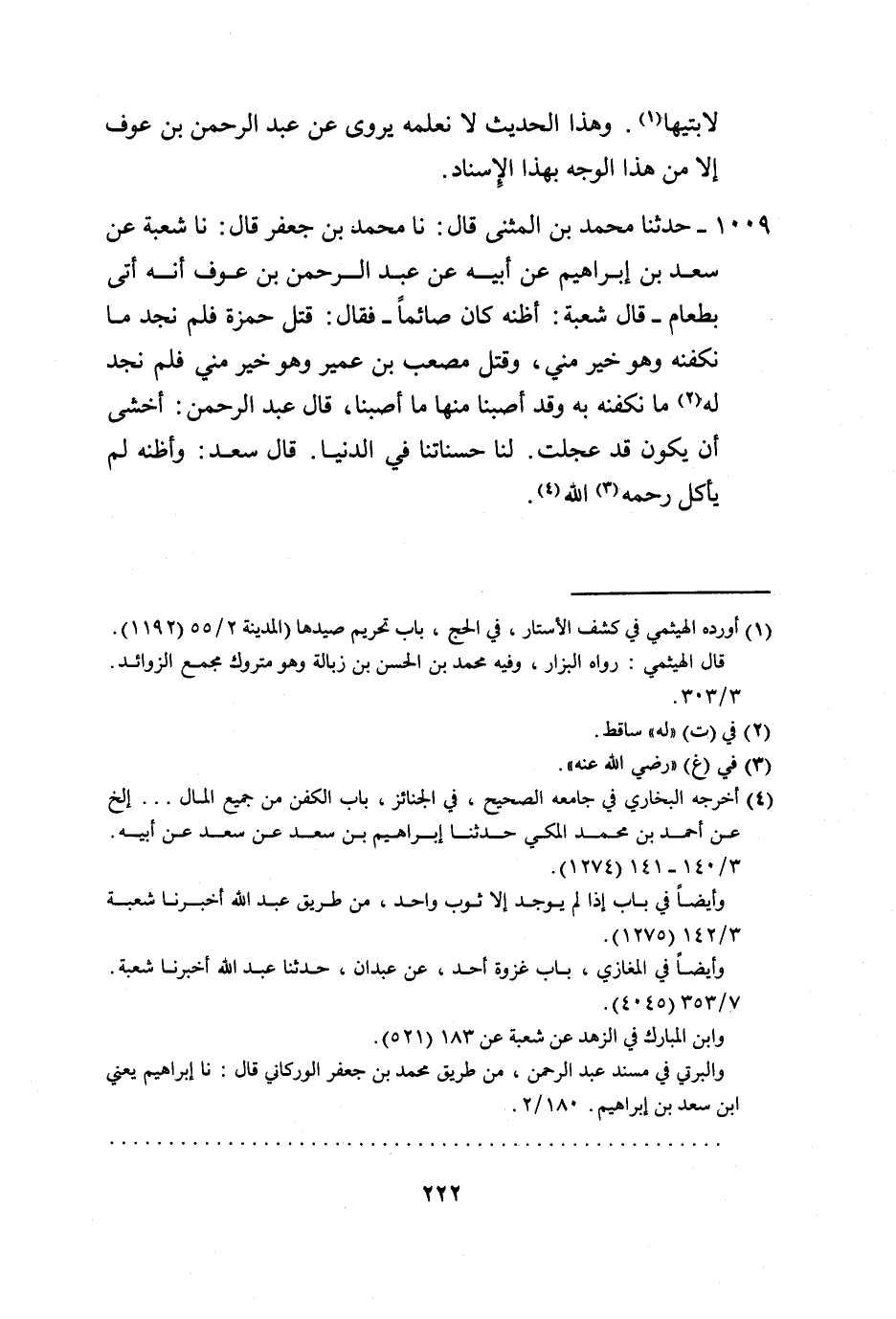 1009 - حَدَّثَنَا مُحَمَّدُ بْنُ الْمُثَنَّى، قَالَ: نا مُحَمَّدُ بْنُ جَعْفَرٍ، قَالَ: نا شُعْبَةُ، عَنْ سَعْدِ بْنِ إِبْرَاهِيمَ، عَنْ أَبِيهِ، عَنْ عَبْدِ الرَّحْمَنِ بْنِ عَوْفٍ، أَنَّهُ أَتَى بِطَعَامٍ قَالَ شُعْبَةُ: أَظُنُّهُ كَانَ صَائِمًا فَقَالَ: قُتِلَ حَمْزَةُ فَلَمْ نَجِدْ مَا نُكَفِّنُهُ وَهُوَ خَيْرٌ مِنِّي وَقُتِلَ مُصْعَبُ بْنُ عُمَيْرٍ، وَهُوَ خَيْرٌ مِنِّي فَلَمْ نَجِدْ لَهُ مَا نُكَفِّنُهُ بِهِ وَقَدْ أَصَبْنَا مِنْهَا مَا أَصَبْنَا قَالَ عَبْدُ الرَّحْمَنِ: «§أَخْشَى أَنْ يَكُونَ قَدْ عُجِّلَتْ لَنَا حَسَنَاتُنَا فِي الدُّنْيَا» قَالَ سَعْدٌ: «وَأَظُنُّهُ لَمْ يَأْكُلْ رَحِمَهُ اللَّهُ» -[223]- وَهَذَا الْحَدِيثُ نُدْخِلُ فِي الْمُسْنَدِ لِأَنَّهُ حُكِيَ، عَنْ حَمْزَةَ، وَعَنْ مُصْعَبٍ، وَأُصِيبَا يَوْمَ أُحُدٍ