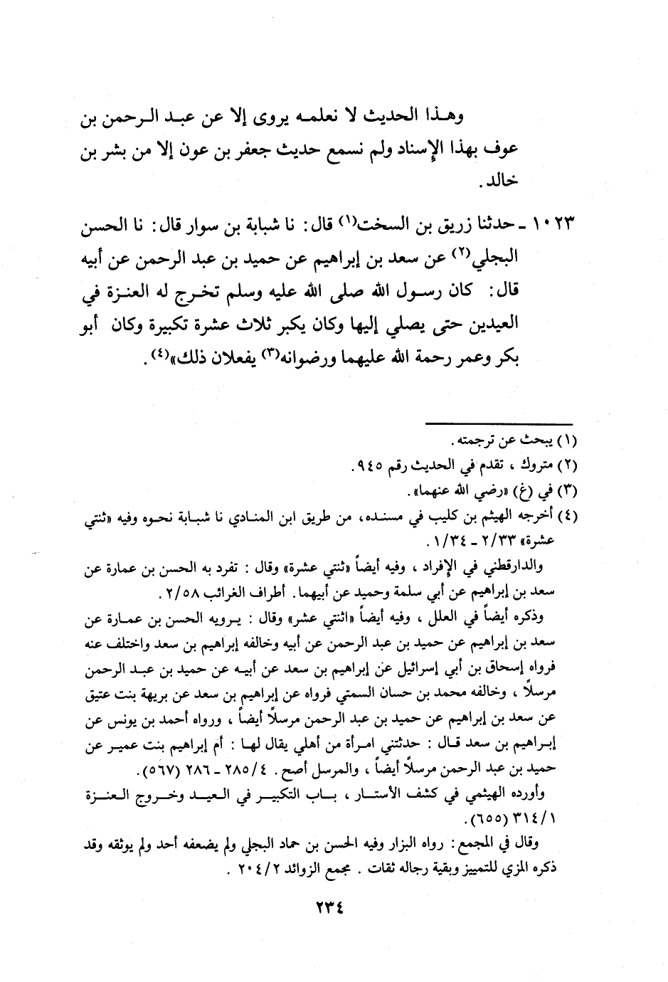 1023 - حَدَّثَنَا زُرَيْقُ بْنُ السَّخْتِ، قَالَ: نا شَبَابَةُ بْنُ سَوَّارٍ، قَالَ: نا الْحَسَنُ الْبَجَلِيُّ، عَنْ سَعْدِ بْنِ إِبْرَاهِيمَ، عَنْ حُمَيْدِ بْنِ عَبْدِ الرَّحْمَنِ، عَنْ أَبِيهِ، قَالَ: كَانَ رَسُولُ اللَّهِ صَلَّى اللهُ عَلَيْهِ وَسَلَّمَ: §تَخْرُجُ لَهُ الْعَنَزَةُ فِي الْعِيدَيْنِ حَتَّى يُصَلِّيَ إِلَيْهَا وَكَانَ يُكَبِّرُ ثَلَاثَ عَشْرَةَ تَكْبِيرَةً، وَكَانَ أَبُو بَكْرٍ، وَعُمَرُ رَحْمَةُ اللَّهِ عَلَيْهِمَا وَرِضْوَانُهُ يَفْعَلَانِ ذَلِكَ -[235]- وَهَذَا الْحَدِيثُ لَا نَعْلَمُهُ يُرْوَى عَنْ عَبْدِ الرَّحْمَنِ بْنِ عَوْفٍ، إِلَّا مِنْ هَذَا الْوَجْهِ بِهَذَا الْإِسْنَادِ، وَالْحَسَنُ الْبَجَلِيُّ هَذَا فَلَيَّنُ الْحَدِيثِ وَقَدْ سَكَتَ النَّاسُ عَنْ حَدِيثِهِ، وَأَحْسَبُهُ الْحَسَنَ بْنَ عُمَارَةَ