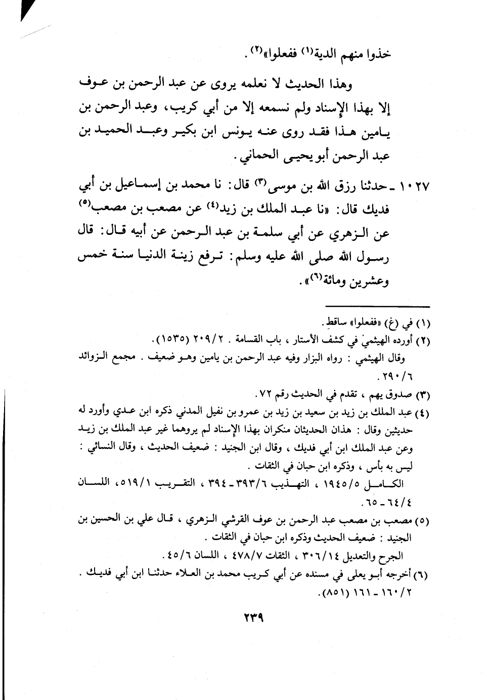 1027 - حَدَّثَنَا رِزْقُ اللَّهِ بْنُ مُوسَى، قَالَ: نا مُحَمَّدُ بْنُ إِسْمَاعِيلَ بْنِ أَبِي فُدَيْكٍ، قَالَ: نا عَبْدُ الْمَلِكِ بْنُ زَيْدٍ، عَنْ مُصْعَبِ بْنِ مُصْعَبٍ، عَنِ الزُّهْرِيِّ، عَنْ أَبِي سَلَمَةَ بْنِ عَبْدِ الرَّحْمَنِ، عَنْ أَبِيهِ، قَالَ: قَالَ رَسُولُ اللَّهِ صَلَّى اللهُ عَلَيْهِ وَسَلَّمَ: «§تُرْفَعُ زِينَةُ الدُّنْيَا سَنَةَ خَمْسٍ وَعِشْرِينَ وَمِائَةٍ» -[240]- وَهَذَا الْحَدِيثُ لَا نَعْلَمُهُ يُرْوَى إِلَّا عَنْ عَبْدِ الرَّحْمَنِ بْنِ عَوْفٍ، وَلَا نَعْلَمُ لَهُ طَرِيقًا إِلَّا هَذَا الطَّرِيقَ