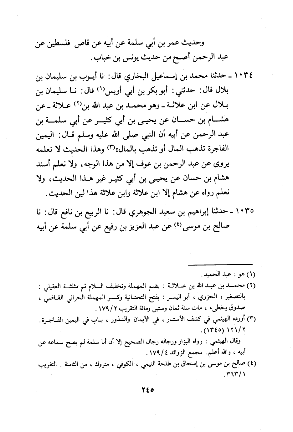 1034 - حَدَّثَنَا مُحَمَّدُ بْنُ إِسْمَاعِيلَ الْبُخَارِيُّ، قَالَ: نا أَيُّوبُ بْنُ سُلَيْمَانَ بْنِ بِلَالٍ، قَالَ: حَدَّثَنِي أَبُو بَكْرِ بْنُ أَبِي أُوَيْسٍ، قَالَ: نا سُلَيْمَانُ بْنُ بِلَالٍ، عَنِ ابْنِ عُلَاثَةَ وَهُوَ مُحَمَّدُ بْنُ عَبْدِ اللَّهِ بْنِ عُلَاثَةَ، عَنْ هِشَامِ بْنِ حَسَّانَ، عَنْ يَحْيَى بْنِ أَبِي كَثِيرٍ، عَنْ أَبِي سَلَمَةَ بْنِ عَبْدِ الرَّحْمَنِ، عَنْ أَبِيهِ، أَنَّ النَّبِيَّ صَلَّى اللهُ عَلَيْهِ وَسَلَّمَ قَالَ: «§الْيَمِينُ الْفَاجِرَةُ تُذْهِبُ الْمَالَ أَوْ تَذْهَبُ بِالْمَالِ» وَهَذَا الْحَدِيثُ لَا نَعْلَمُهُ يُرْوَى عَنْ عَبْدِ الرَّحْمَنِ بْنِ عَوْفٍ، إِلَّا مِنْ هَذَا الْوَجْهِ وَلَا نَعْلَمُ أَسْنَدَ هِشَامُ بْنُ حَسَّانَ، عَنْ يَحْيَى بْنِ أَبِي كَثِيرٍ، غَيْرَ هَذَا الْحَدِيثِ وَلَا نَعْلَمُ رَوَاهُ عَنْ هِشَامٍ إِلَّا ابْنُ عُلَاثَةَ، وَابْنُ عُلَاثَةَ هَذَا لَيِّنُ الْحَدِيثِ