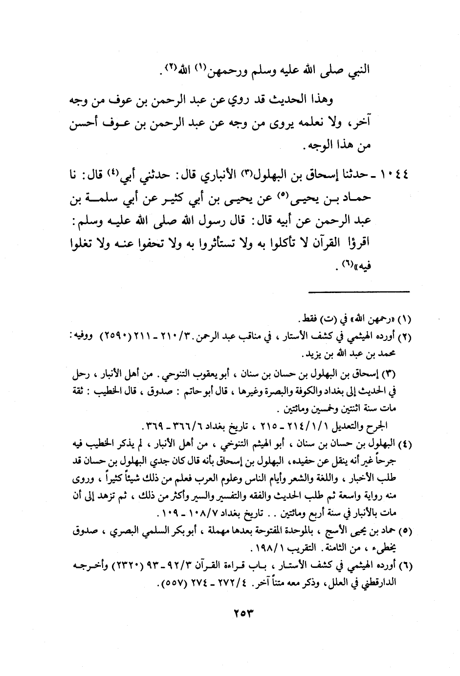 1044 - حَدَّثَنَا إِسْحَاقُ بْنُ الْبُهْلُولِ الْأَنْبَارِيُّ، قَالَ: حَدَّثَنِي أَبِي قَالَ: نا حَمَّادُ بْنُ يَحْيَى، عَنْ يَحْيَى بْنِ أَبِي كَثِيرٍ، عَنْ أَبِي سَلَمَةَ بْنِ عَبْدِ الرَّحْمَنِ، عَنْ أَبِيهِ، قَالَ: قَالَ رَسُولُ اللَّهِ صَلَّى اللهُ عَلَيْهِ وَسَلَّمَ: «§اقْرَءُوا الْقُرْآنَ لَا تَأْكُلُوا بِهِ وَلَا تَسْتَأْثِرُوا بِهِ وَلَا تَحْفُوا عَنْهُ وَلَا تَغْلُوا فِيهِ» -[254]- وَهَذَا الْحَدِيثُ خَطَأٌ إِنَّمَا خَطَأَهُ مِنْ حَمَّادِ بْنِ يَحْيَى، لِأَنَّهُ لَيِّنُ الْحَدِيثِ وَالْحَدِيثُ الصَّحِيحُ إِنَّمَا رَوَاهُ يَحْيَى بْنُ أَبِي كَثِيرٍ، عَنْ زَيْدِ بْنِ سَلَّامٍ، عَنْ أَبِي رَاشِدٍ الْحُبْرَانِيِّ، عَنْ عَبْدِ الرَّحْمَنِ بْنِ شِبْلٍ
