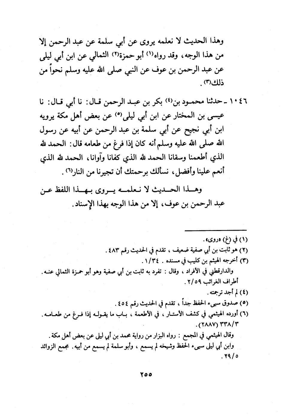 1046 - حَدَّثَنَا مَحْمُودُ بْنُ بَكْرِ بْنِ عَبْدِ الرَّحْمَنِ، قَالَ: نا أَبِي قَالَ،: نا عِيسَى بْنُ الْمُخْتَارِ، عَنِ ابْنِ أَبِي لَيْلَى، عَنْ بَعْضِ أَهْلِ مَكَّةَ يَرْوِيهُ ابْنُ أَبِي نَجِيحٍ، عَنْ أَبِي سَلَمَةَ بْنِ عَبْدِ الرَّحْمَنِ، عَنْ أَبِيهِ، عَنْ رَسُولِ اللَّهِ صَلَّى اللهُ عَلَيْهِ وَسَلَّمَ أَنَّهُ كَانَ إِذَا فَرَغَ مِنْ طَعَامِهِ قَالَ: «§الْحَمْدُ لِلَّهِ الَّذِي أَطْعَمَنَا وَسَقَانَا، الْحَمْدُ لِلَّهِ الَّذِي كَفَانَا وَآوَانَا , الْحَمْدُ لِلَّهِ الَّذِي أَنْعَمَ عَلَيْنَا وَأَفْضَلَ، نَسْأَلُكَ بِرَحْمَتِكَ أَنْ تُجِيرَنَا مِنَ النَّارِ» وَهَذَا الْحَدِيثُ لَا نَعْلَمُهُ يُرْوَى بِهَذَا اللَّفْظِ، عَنْ عَبْدِ الرَّحْمَنِ بْنِ عَوْفٍ إِلَّا مِنْ هَذَا الْوَجْهِ بِهَذَا الْإِسْنَادِ