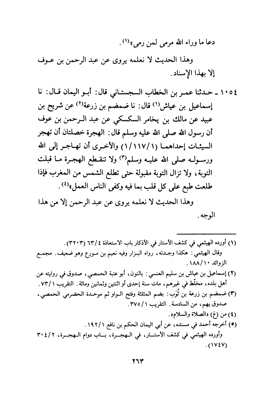 1054 - حَدَّثَنَا عُمَرُ بْنُ الْخَطَّابِ السِّجِسْتَانِيُّ، قَالَ: أَبُو الْيَمَانِ قَالَ: نا إِسْمَاعِيلُ بْنُ عَيَّاشٍ، قَالَ: نا ضَمْضَمُ بْنُ زُرْعَةَ، عَنْ شُرَيْحِ بْنِ عُبَيْدٍ، عَنْ مَالِكِ بْنِ يَخَامِرٍ السَّكْسَكِيِّ، عَنْ عَبْدِ الرَّحْمَنِ بْنِ عَوْفٍ، أَنَّ رَسُولَ اللَّهِ صَلَّى اللهُ عَلَيْهِ وَسَلَّمَ قَالَ: «§الْهِجْرَةُ خَصْلَتَانِ أَنْ تَهْجُرَ السَّيِّئَاتِ إِحْدَاهُمَا وَالْأُخْرَى أَنْ تُهَاجِرَ إِلَى اللَّهِ وَرَسُولِهِ صَلَّى اللهُ عَلَيْهِ وَسَلَّمَ، وَلَا تَنْقَطِعُ الْهِجْرَةُ مَا قُبِلَتِ التَّوْبَةُ وَلَا تَزَالُ التَّوْبَةُ مَقْبُولَةً حَتَّى تَطْلُعَ الشَّمْسُ مِنَ الْمَغْرِبِ، فَإِذَا طَلَعَتْ طُبِعَ عَلَى كُلِّ قَلْبٍ بِمَا فِيهِ وَكَفَى النَّاسَ الْعَمَلُ» . وَهَذَا الْحَدِيثُ لَا نَعْلَمُهُ يُرْوَى عَنْ عَبْدِ الرَّحْمَنِ إِلَّا مِنْ هَذَا الْوَجْهِ