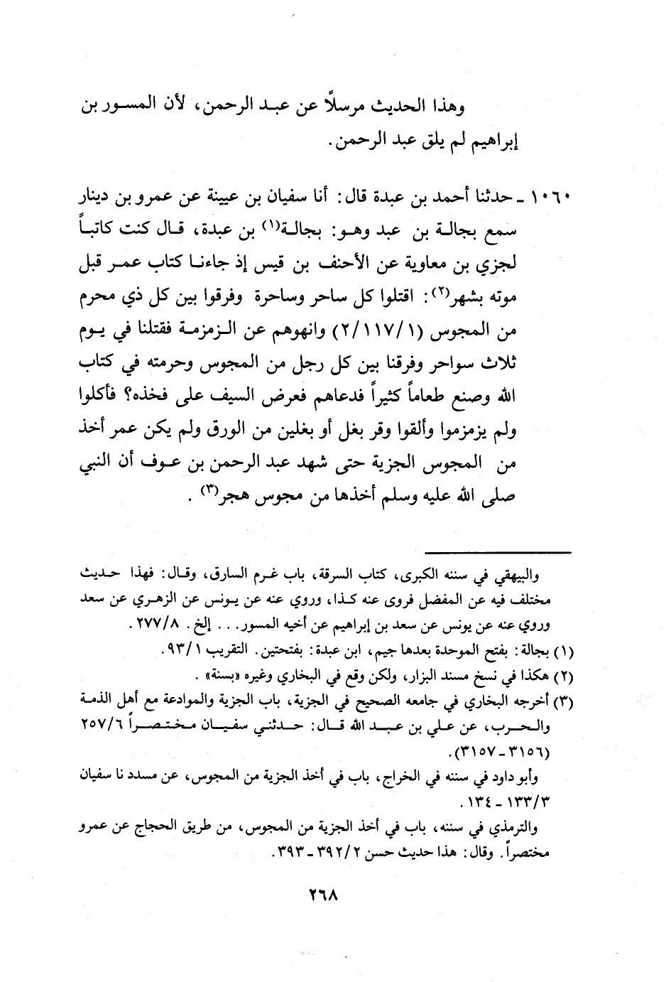 1060 - حَدَّثَنَا أَحْمَدُ بْنُ عَبْدَةَ، قَالَ: أنا سُفْيَانُ بْنُ عُيَيْنَةَ، عَنْ عَمْرِو بْنِ دِينَارٍ، سَمِعَ بَجَالَةَ بْنَ عَبْدٍ وَهُوَ بَجَالَةُ بْنُ عَبْدَةَ، قَالَ: كُنْتُ كَاتِبًا لِجَزْءِ بْنِ مُعَاوِيَةَ، عَنِ الْأَحْنَفِ بْنِ قَيْسٍ، إِذْ جَاءَنَا كِتَابُ عُمَرَ قَبْلَ مَوْتِهِ بِشَهْرٍ: «§اقْتُلُوا كُلَّ سَاحِرٍ وَسَاحِرَةٍ، وَفَرِّقُوا بَيْنَ كُلِّ ذِي مَحْرَمٍ مِنَ الْمَجُوسِ، وَانْهَوْهُمْ عَنِ الزَّمْزَمَةِ» فَقَتَلْنَا فِي يَوْمٍ ثَلَاثَ سَوَاحِرَ وَفَرَّقْنَا بَيْنَ كُلِّ رَجُلٍ مِنَ الْمَجُوسِ وَحُرْمَتِهِ فِي كِتَابِ اللَّهِ، وَصَنَعَ طَعَامًا كَثِيرًا فَدَعَاهُمْ فَعَرَضَ السَّيْفَ عَلَى فَخْذِهِ، فَأَكَلُوا وَلَمْ يُزَمْزِمُوا، وَأَلْقَوْا وِقْرَ بَغْلٍ أَوْ بَغْلَيْنِ مِنَ الْوَرِقِ، وَلَمْ يَكُنْ عُمَرُ أَخَذَ مِنَ الْمَجُوسِ الْجِزْيَةَ حَتَّى شَهِدَ عَبْدُ الرَّحْمَنِ بْنُ عَوْفٍ أَنَّ النَّبِيَّ صَلَّى اللهُ عَلَيْهِ وَسَلَّمَ أَخَذَهَا مِنْ مَجُوسِ هَجَرَ " -[270]- وَهَذَا الْحَدِيثُ لَا نَعْلَمُهُ يُرْوَى عَنْ عَبْدِ الرَّحْمَنِ بْنِ عَوْفٍ، إِلَّا بِهَذَا الْإِسْنَادِ