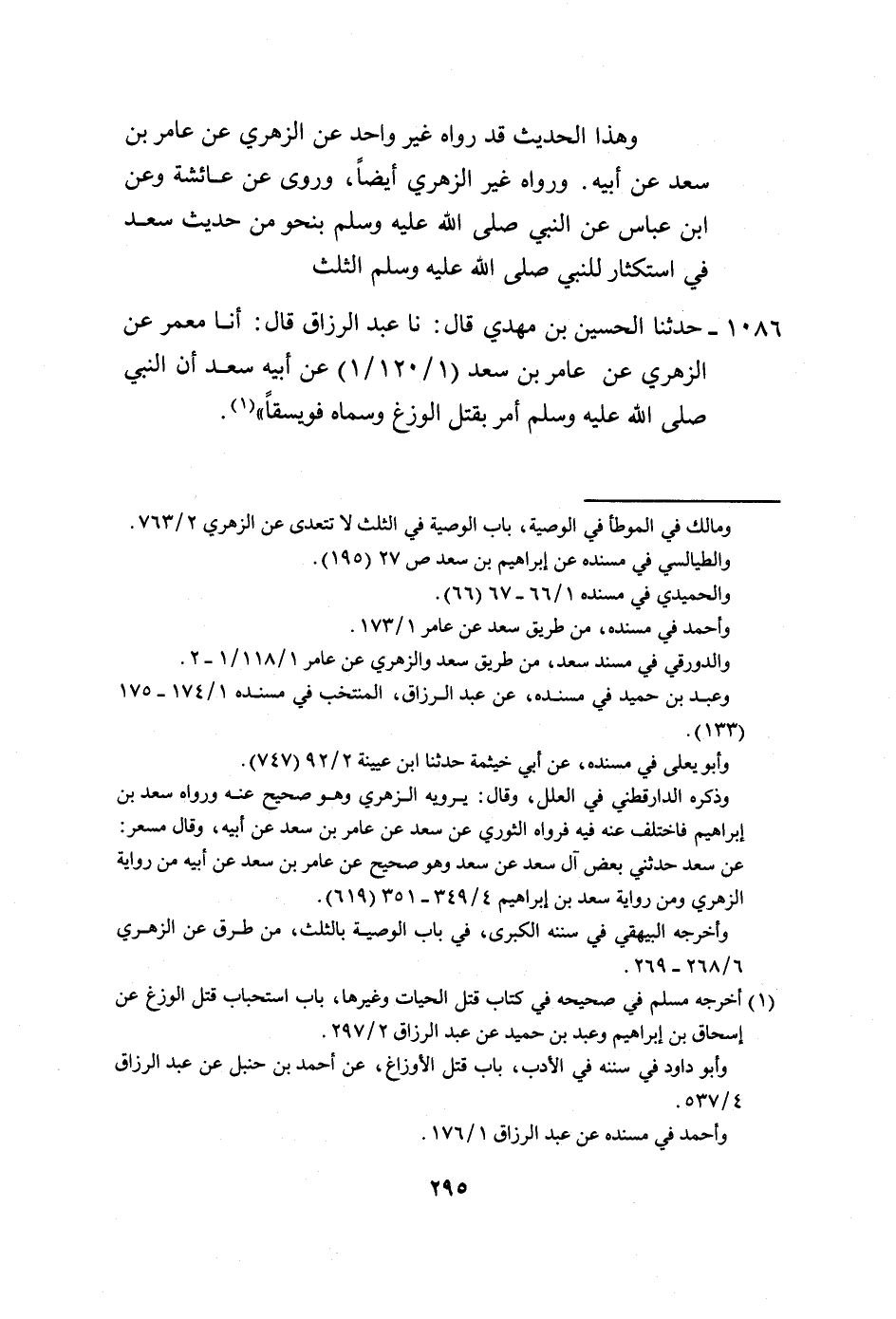 1086 - حَدَّثَنَا الْحُسَيْنُ بْنُ مَهْدِيٍّ، قَالَ: نا عَبْدُ الرَّزَّاقِ، قَالَ: أنا مَعْمَرٌ، عَنِ الزُّهْرِيِّ، عَنْ عَامِرِ بْنِ سَعْدٍ، عَنْ أَبِيهِ سَعْدٍ، أَنَّ النَّبِيَّ صَلَّى اللهُ عَلَيْهِ وَسَلَّمَ: §أَمَرَ بِقَتْلِ الْوَزَغِ وَسَمَّاهُ فُوَيْسِقًا -[296]-. وَهَذَا الْحَدِيثُ لَا نَعْلَمُهُ يُرْوَى عَنْ سَعْدٍ، عَنِ النَّبِيِّ صَلَّى اللهُ عَلَيْهِ وَسَلَّمَ، إِلَّا عَنْ عَامِرٍ، عَنْهُ وَلَا نَعْلَمُ رَوَاهُ عَنْ عَامِرِ بْنِ سَعْدٍ، إِلَّا الزُّهْرِيُّ، وَلَا عَنِ الزُّهْرِيِّ، إِلَّا مَعْمَرٌ، وَلَا عَنْ مَعْمَرٍ، إِلَّا عَبْدُ الرَّزَّاقِ، إِلَّا حَدِيثًا أَخْطَأَ فِيهِ يَحْيَى بْنُ أَبِي أُنَيْسَةَ، وَهُوَ ضَعِيفُ الْحَدِيثِ فَرَوَاهُ عَنِ الزُّهْرِيِّ، عَنْ عُرْوَةَ، عَنْ عَائِشَةَ، عَنْ سَعْدٍ، وَهُوَ خَطَأٌ مِنْ يَحْيَى بْنِ أَبِي أُنَيْسَةَ