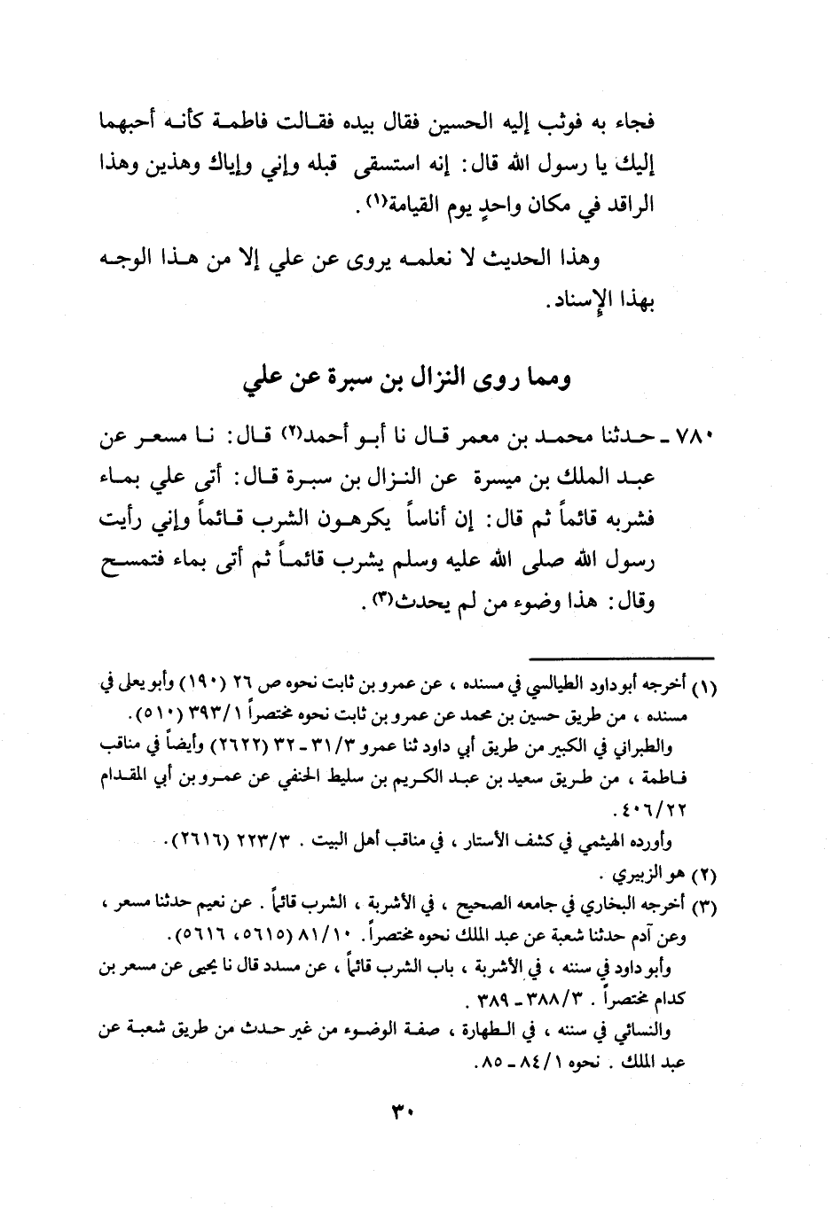 780 - حَدَّثَنَا مُحَمَّدُ بْنُ مَعْمَرٍ، قَالَ: نا أَبُو أَحْمَدَ، قَالَ: نا مِسْعَرٌ، عَنْ عَبْدِ الْمَلِكِ بْنِ مَيْسَرَةَ، عَنِ النَّزَّالِ بْنِ سَبْرَةَ، قَالَ: أَتَى عَلِيٌّ بِمَاءٍ فَشَرِبَهُ قَائِمًا ثُمَّ قَالَ: إِنَّ أُنَاسًا يَكْرَهُونَ الشُّرْبَ قَائِمًا، وَإِنِّي §رَأَيْتُ رَسُولَ اللَّهِ صَلَّى اللهُ عَلَيْهِ وَسَلَّمَ: يَشْرَبُ قَائِمًا ثُمَّ أَتَى بِمَاءٍ فَتَمَسَّحَ وَقَالَ: هَذَا وُضُوءُ مَنْ لَمْ يُحْدِثْ " -[31]- وَعَبْدُ الْمَلِكِ بْنُ مَيْسَرَةَ رَوَى عَنْهُ الْأَئِمَّةُ: الْأَعْمَشُ، وَشُعْبَةُ، وَمِسْعَرٌ، وَغَيْرُهُمْ، وَقَدْ رُوِيَ عَنْ عَلِيٍّ مِنْ غَيْرِ وَجْهٍ، وَهَذَا الْفِعْلُ قَدْ رُوِيَ عَنِ النَّبِيِّ صَلَّى اللهُ عَلَيْهِ وَسَلَّمَ: أَنَّهُ شَرِبَ قَائِمًا مِنْ وُجُوهٍ فَرَوَى ذَلِكَ ابْنُ عُمَرَ، وَعَائِشَةُ، وَعِمْرَانُ بْنُ حُصَيْنٍ، وَعَبْدُ اللَّهِ بْنُ عَمْرٍو، وَابْنُ عَبَّاسٍ، وَأُمُّ سُلَيْمٍ، وَعَبْدُ اللَّهِ بْنُ أُنَيْسٍ، وَغَيْرُهُمْ أَنَّهُ شَرِبَ قَائِمًا وَذَكَرَهُ عَنْ أَبِي نُعَيْمٍ، وَأَيْضًا عَنْ مِسْعَرٍ عَنْ عَبْدِ الْمَلِكِ بْنِ مَيْسَرَةَ عَنِ النَّزَّالِ، عَنْ عَلِيٍّ بِنَحْوِهِ قَالَ: ثُمَّ أَخَذَ مِنَ الْمَاءِ أَرَاهُ قَالَ: فَمَسَحَ وَجْهَهُ -[32]- وَيَدَيْهِ وَرِجْلَيْهِ وَقَالَ: هَكَذَا وُضُوءُ مَنْ لَمْ يُحْدِثْ