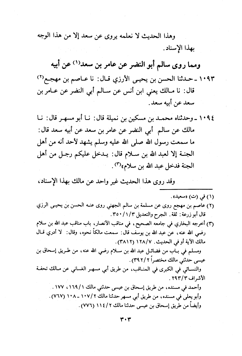 1094 - وَحَدَّثَنَاهُ مُحَمَّدُ بْنُ مِسْكِينِ بْنِ نُمَيْلَةَ، قَالَ: نا أَبُو مُسْهِرٍ، قَالَ: نا مَالِكٌ، عَنْ سَالِمِ أَبِي النَّضْرِ، عَنْ عَامِرِ بْنِ سَعْدٍ، عَنْ أَبِيهِ سَعْدٍ، قَالَ: مَا سَمِعْتُ رَسُولَ اللَّهِ صَلَّى اللهُ عَلَيْهِ وَسَلَّمَ يَشْهَدُ لِأَحَدٍ أَنَّهُ مِنْ أَهْلِ الْجَنَّةِ إِلَّا لعَبْدِ اللَّهِ بْنِ سَلَّامٍ قَالَ «§يَدْخُلُ عَلَيْكُمْ رَجُلٌ مِنْ أَهْلِ الْجَنَّةِ» فَدَخَلَ عَبْدُ اللَّهِ بْنُ سَلَّامٍ " وَقَدْ رَوَى هَذَا الْحَدِيثَ غَيْرُ وَاحِدٍ عَنْ مَالِكٍ، بِهَذَا الْإِسْنَادِ -[304]- وَزَادَ فِيهِ بَعْضُهُمْ قَالَ: وَنَزَلَتْ هَذِهِ الْآيَةُ {وَشَهِدَ شَاهِدٌ مِنْ بَنِي إِسْرَائِيلَ، عَلَى مِثْلِهِ فَآمَنَ وَاسْتَكْبَرْتُمْ} [الأحقاف: 10] وَلَا نَعْلَمُ رَوَى هَذَا الْكَلَامَ إِلَّا سَعْدٌ