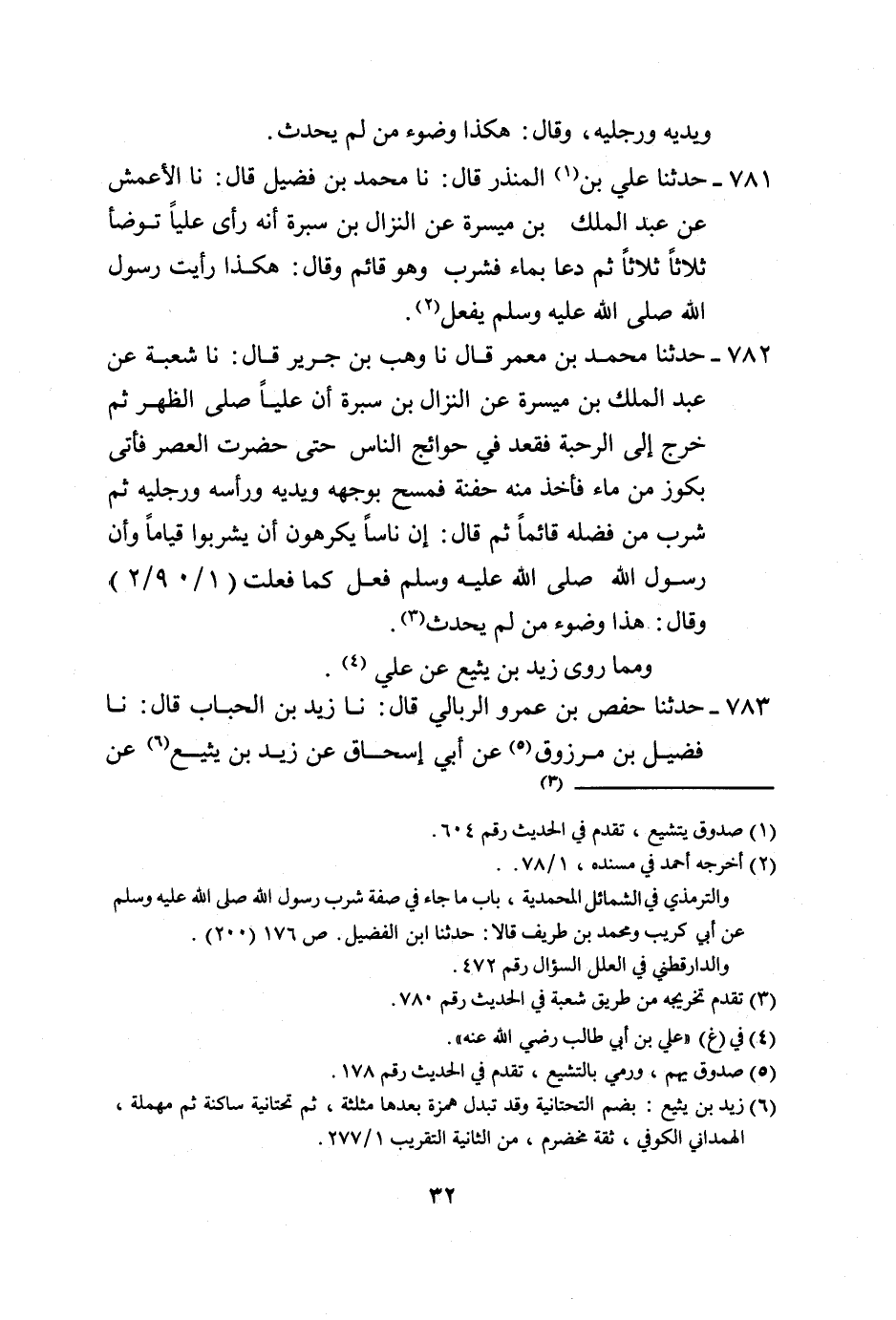 781 - حَدَّثَنَا عَلِيُّ بْنُ الْمُنْذِرِ، قَالَ: نا مُحَمَّدُ بْنُ فُضَيْلٍ، قَالَ: نا الْأَعْمَشُ، عَنْ عَبْدِ الْمَلِكِ بْنِ مَيْسَرَةَ، عَنِ النَّزَّالِ بْنِ سَبْرَةَ، §أَنَّهُ رَأَى عَلِيًّا تَوَضَّأَ ثَلَاثًا ثَلَاثًا ثُمَّ دَعَا بِمَاءٍ فَشَرِبَ وَهُوَ قَائِمٌ وَقَالَ: هَكَذَا رَأَيْتُ رَسُولَ اللَّهِ صَلَّى اللهُ عَلَيْهِ وَسَلَّمَ يَفْعَلُ