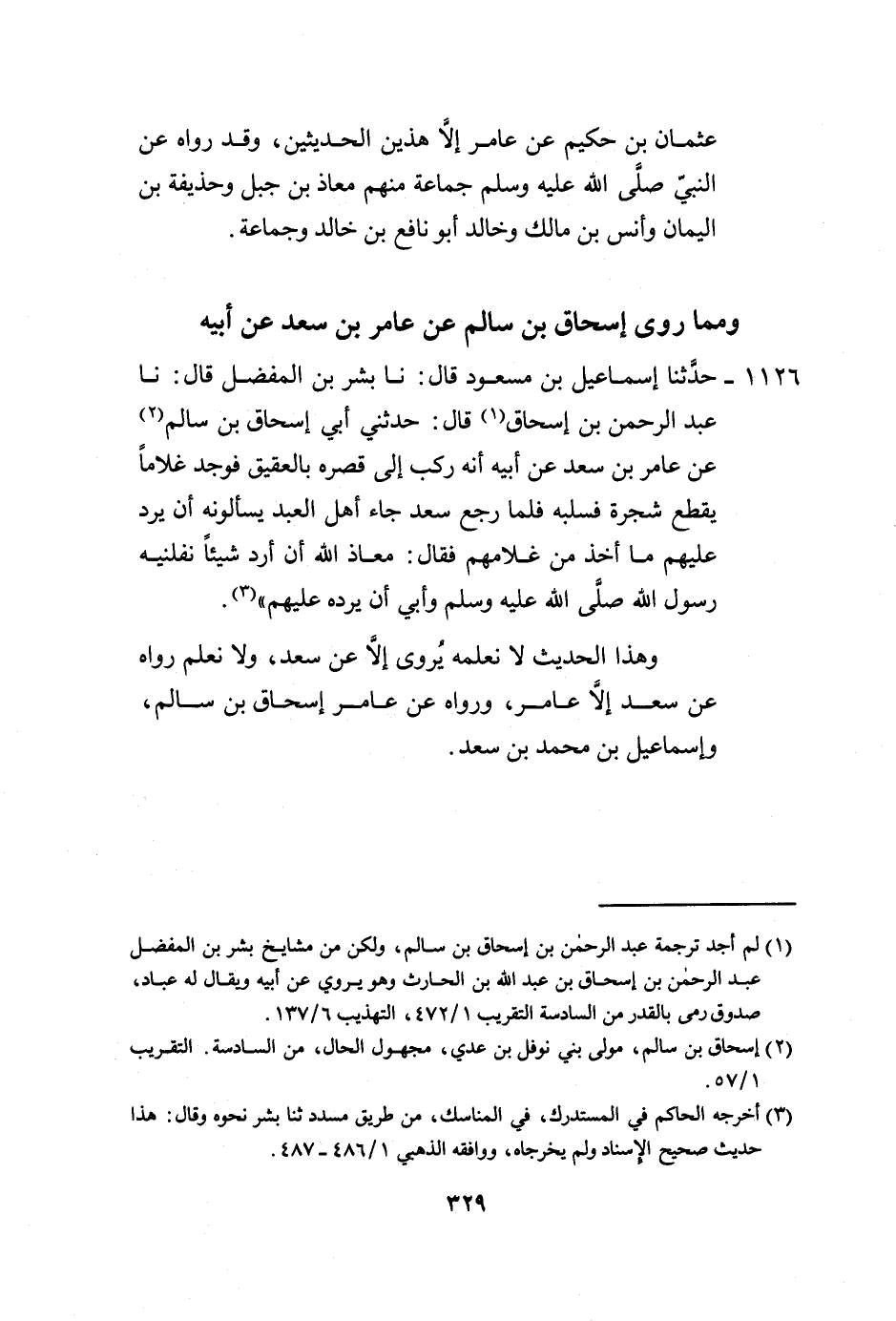 1126 - حَدَّثَنَا إِسْمَاعِيلُ بْنُ مَسْعُودٍ، قَالَ: نا بِشْرُ بْنُ الْمُفَضَّلِ، قَالَ: نا عَبْدُ الرَّحْمَنِ بْنُ إِسْحَاقَ، قَالَ: حَدَّثَنِي أَبِي إِسْحَاقُ بْنُ سَالِمٍ، عَنْ عَامِرِ بْنِ سَعْدٍ، عَنْ أَبِيهِ، أَنَّهُ رَكِبَ إِلَى قَصْرِهِ بِالْعَقِيقِ فَوَجَدَ غُلَامًا يَقْطَعُ شَجَرَةً، فَسَلَبَهُ فَلَمَّا رَجَعَ سَعْدٌ جَاءَ أَهْلُ الْعَبْدِ يَسْأَلُونَهُ أَنْ يَرُدَّ عَلَيْهِمْ مَا أَخَذَ مِنْ غُلَامِهِمْ، فَقَالَ مَعَاذَ اللَّهِ: §أَنْ أَرُدَّ شَيْئًا نَفَّلَنِيهِ رَسُولُ اللَّهِ صَلَّى اللهُ عَلَيْهِ وَسَلَّمَ وَأَبَى أَنْ يَرُدَّهُ عَلَيْهِمْ " وَهَذَا الْحَدِيثُ لَا نَعْلَمُهُ يُرْوَى إِلَّا عَنْ سَعْدٍ وَلَا نَعْلَمُ رَوَاهُ عَنْ سَعْدٍ، إِلَّا عَامِرٌ، وَرَوَاهُ عَنْ عَامِرٍ إِسْحَاقُ بْنُ سَالِمٍ، وَإِسْمَاعِيلُ بْنُ مُحَمَّدِ بْنِ سَعْدٍ