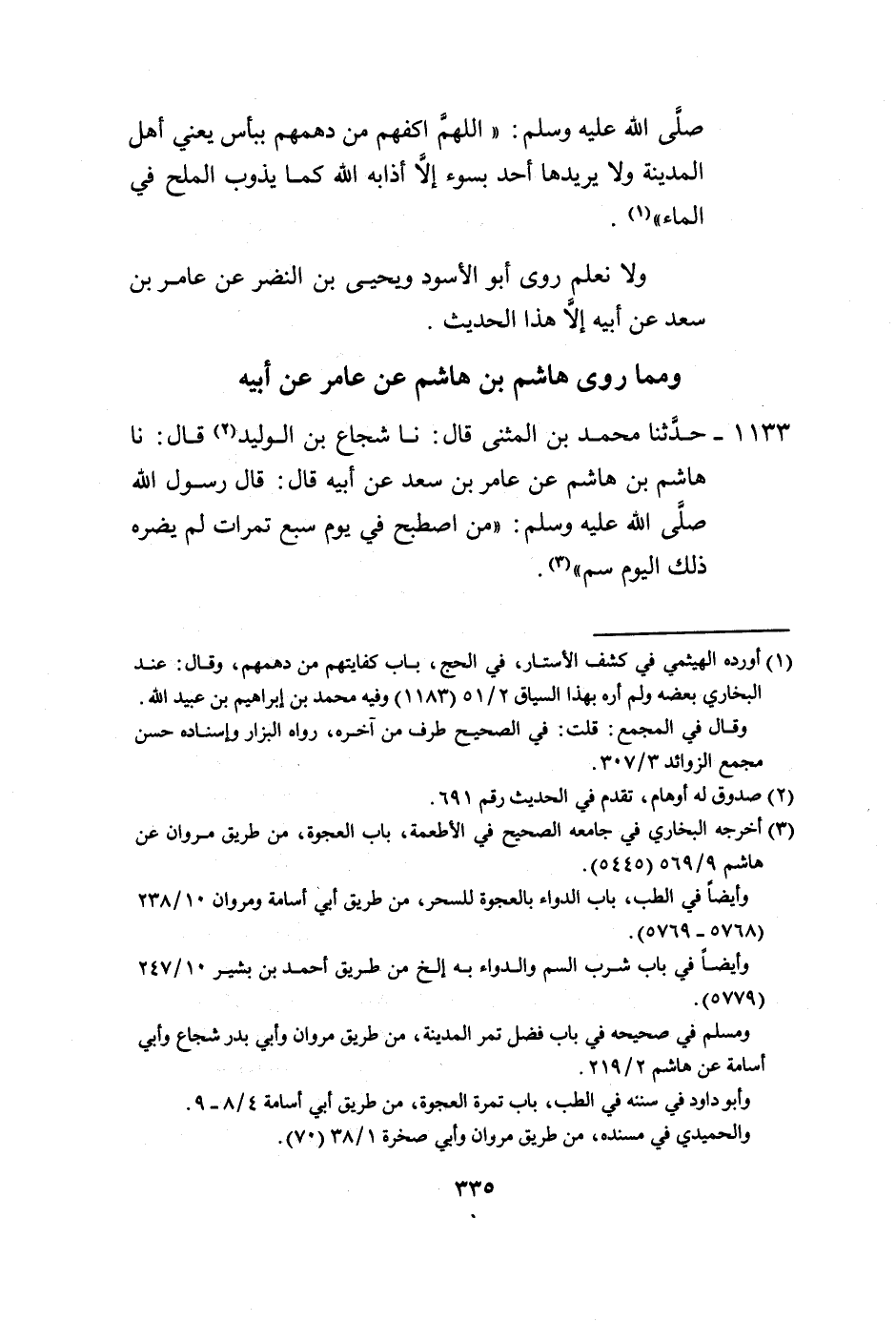 1133 - حَدَّثَنَا مُحَمَّدُ بْنُ الْمُثَنَّى، قَالَ: نا شُجَاعُ بْنُ الْوَلِيدِ، قَالَ: نا هَاشِمُ بْنُ هَاشِمٍ، عَنْ عَامِرِ بْنِ سَعْدٍ، عَنْ أَبِيهِ، قَالَ: قَالَ رَسُولُ اللَّهِ صَلَّى اللهُ عَلَيْهِ وَسَلَّمَ: «§مَنِ اصْطَبَحَ فِي يَوْمٍ سَبْعَ تَمَرَاتٍ لَمْ يَضُرَّهُ ذَلِكَ الْيَوْمَ سَمٌّ» -[336]-. وَهَذَا الْحَدِيثُ لَا نَعْلَمُهُ يُرْوَى عَنْ سَعْدٍ، إِلَّا مِنْ هَذَا الْوَجْهِ وَلَا نَعْلَمُ رَوَاهُ إِلَّا هَاشِمُ بْنُ هَاشِمٍ وَقَدِ اخْتُلِفَ عَلَى هَاشِمِ بْنِ هَاشِمٍ فَرَوَاهُ بَعْضُهُمُ عَنْ هَاشِمِ بْنِ هَاشِمٍ، عَنْ عَامِرِ بْنِ سَعْدٍ، عَنْ أَبِيهِ، وَرَوَاهُ بَعْضُهُمْ عَنْ هَاشِمِ بْنِ هَاشِمٍ، عَنْ عَائِشَةَ ابْنَةِ سَعْدٍ عَنْ أَبِيهَا. وَرَوَاهُ بَعْضُهُمْ عَنْ هَاشِمِ بْنِ هَاشِمٍ، عَنْ عَامِرِ بْنِ سَعْدٍ، عَنْ -[337]- خَالِدِ بْنِ سَعْدٍ فَأَخْطَأَ فِيهِ لَأَنَّا لَا نَعْلَمُ لِسَعْدٍ ابْنًا يُقَالُ لَهُ خَالِدٌ