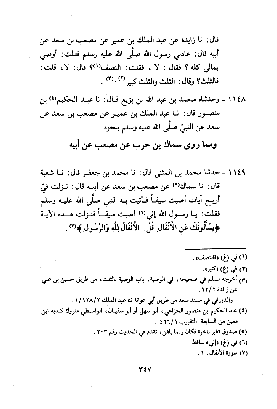 1149 - حَدَّثَنَا مُحَمَّدُ بْنُ الْمُثَنَّى، قَالَ: نا مُحَمَّدُ بْنُ جَعْفَرٍ، قَالَ: نا شُعْبَةُ، قَالَ: نا سِمَاكٌ، عَنْ مُصْعَبِ بْنِ سَعْدٍ، عَنْ أَبِيهِ، قَالَ: نَزَلَتْ فِي أَرْبَعُ آيَاتٍ أَصَبْتُ سَيْفًا فَأَتَيْتُ بِهِ النَّبِيَّ صَلَّى اللهُ عَلَيْهِ وَسَلَّمَ، فَقُلْتُ يَا رَسُولَ اللَّهِ: إِنِّي أَصَبْتُ سَيْفًا فَنَزَلَتْ هَذِهِ الْآيَةُ: {§يَسْأَلُونَكَ عَنِ الْأَنْفَالِ قُلِ الْأَنْفَالُ لِلَّهِ وَالرَّسُولِ} [الأنفال: 1]