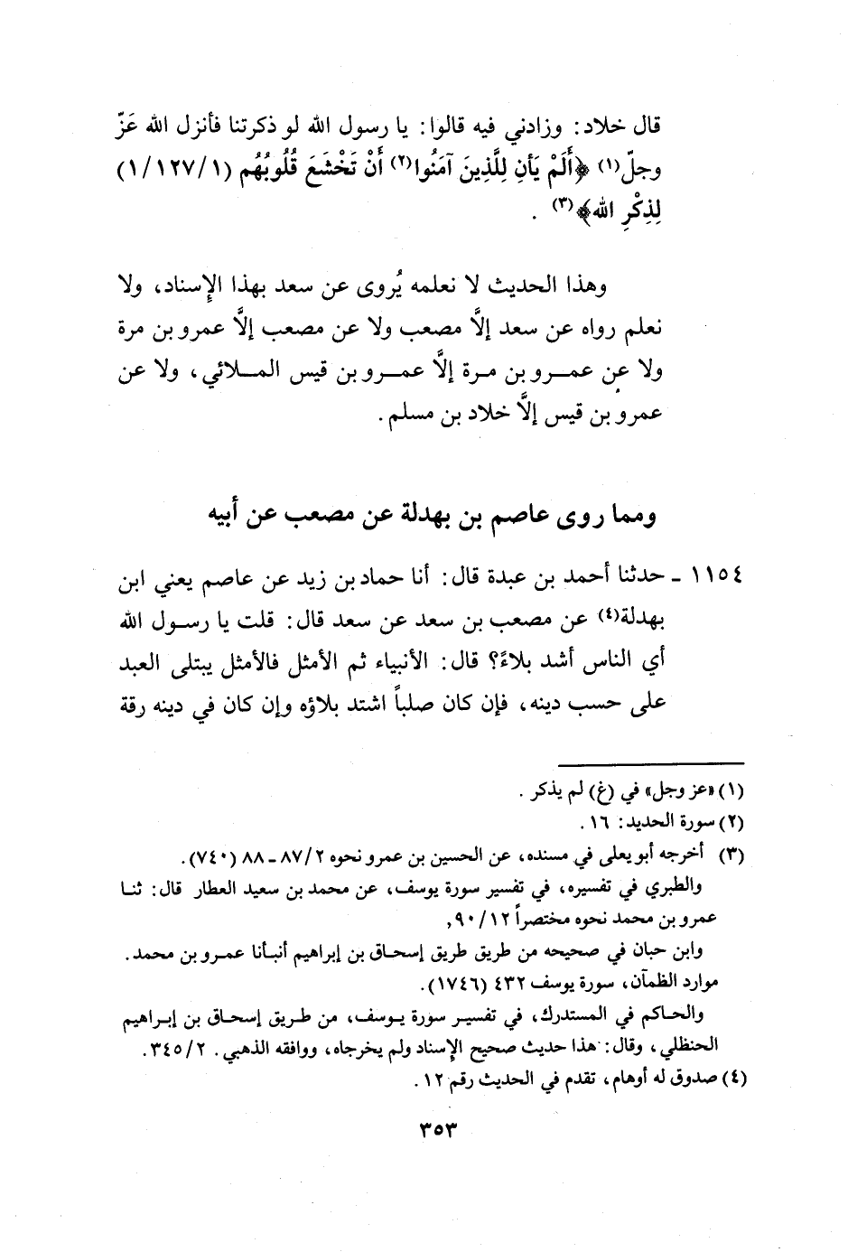 1154 - حَدَّثَنَا أَحْمَدُ بْنُ عَبْدَةَ، قَالَ: أنا حَمَّادُ بْنُ زَيْدٍ، عَنْ عَاصِمٍ يَعْنِي ابْنَ بَهْدَلَةَ، عَنْ مُصْعَبِ بْنِ سَعْدٍ، عَنْ سَعْدٍ، قَالَ: قُلْتُ: يَا رَسُولَ اللَّهِ أَيُّ النَّاسِ أَشَدُّ بَلَاءً قَالَ: §الْأَنْبِيَاءُ ثُمَّ الْأَمْثَلُ فَالْأَمْثَلُ يُبْتَلَى الْعَبْدُ عَلَى حَسَبِ دِينِهِ فَإِنْ كَانَ صُلْبًا اشْتَدَّ بَلَاؤُهُ وَإِنْ كَانَ فِي دِينِهِ رِقَّةٍ -[354]- ابْتُلِيَ عَلَى قَدْرِ ذَلِكَ فَمَا تَبْرَحُ الْبَلَايَا بِالْعَبْدِ حَتَّى تَدَعَهُ يَمْشِي عَلَى الْأَرْضِ مَا عَلَيْهِ خَطِيئَةٌ وَهَذَا الْحَدِيثُ لَا نَعْلَمُهُ يُرْوَى إِلَّا عَنْ سَعْدٍ، عَنِ النَّبِيِّ صَلَّى اللهُ عَلَيْهِ وَسَلَّمَ، وَلَا نَعْلَمُ رَوَاهُ عَنْ سَعْدٍ، بِهَذَا اللَّفْظِ إِلَّا مُصْعَبٌ، وَرَوَى هَذَا الْحَدِيثَ عَنْ عَاصِمٍ جَمَاعَةٌ مِنْهُمْ حَمَّادٌ، وَالْعَلَاءُ بْنُ -[355]- الْمُسَيَّبِ، وَهِشَامٌ صَاحِبُ الدَّسْتُوَائِيِّ وَغَيْرُهُمْ