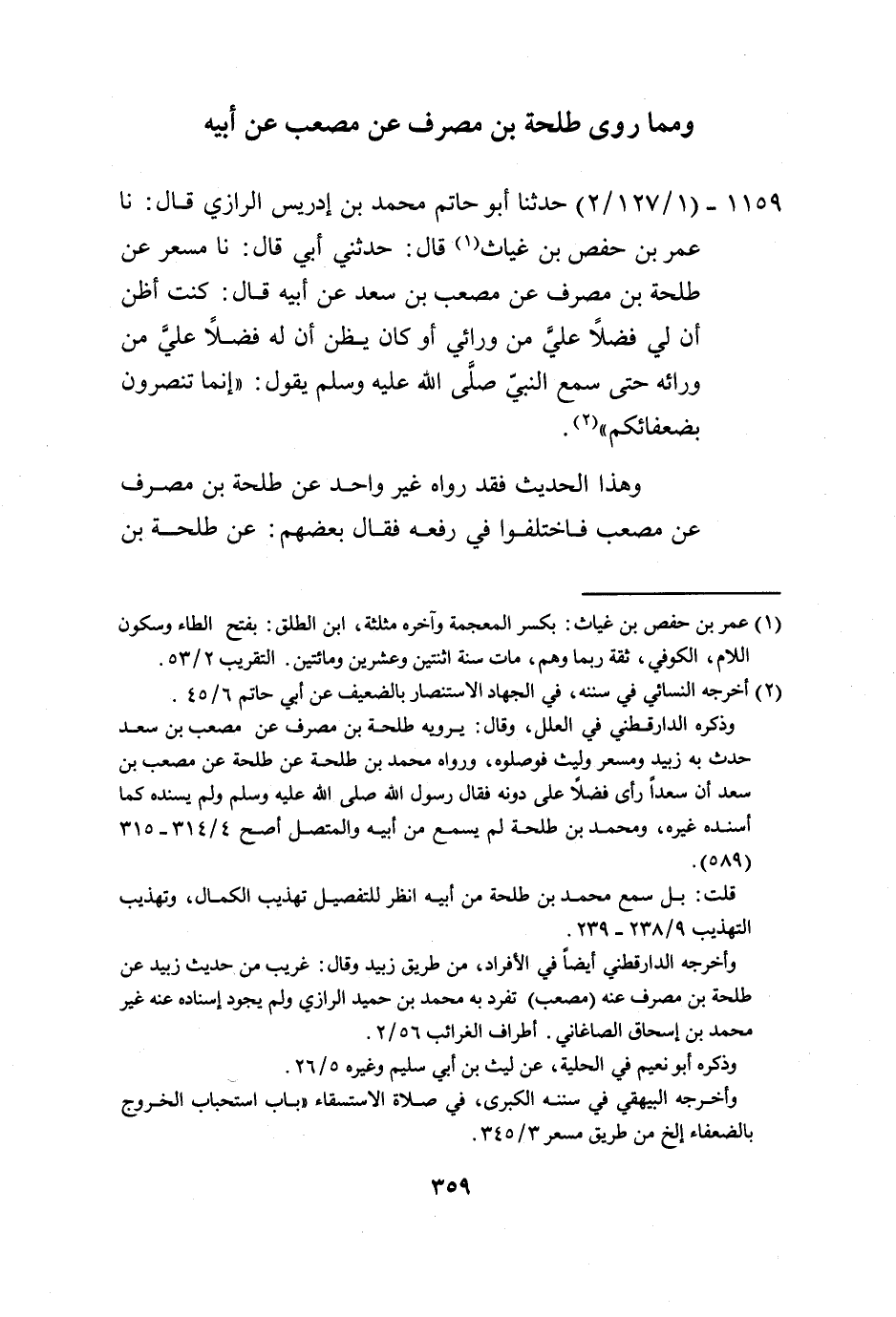 1159 - حَدَّثَنَا أَبُو حَاتِمٍ مُحَمَّدُ بْنُ إِدْرِيسَ الرَّازِيُّ، قَالَ: نا عُمَرُ بْنُ حَفْصِ بْنِ غِيَاثٍ، قَالَ: حَدَّثَنِي أَبِي قَالَ،: نا مِسْعَرٌ، عَنْ طَلْحَةَ بْنِ مُصَرِّفٍ، عَنْ مُصْعَبِ بْنِ سَعْدٍ، عَنْ أَبِيهِ، قَالَ: كُنْتُ أَظُنُّ أَنَّ لِي، فَضْلًا عَلَى مَنْ وَرَائِي أَوْ كَانَ يَظُنُّ أَنَّ لَهُ فَضْلًا عَلَى مَنْ وَرَائِهِ حَتَّى سَمِعَ النَّبِيَّ صَلَّى اللهُ عَلَيْهِ وَسَلَّمَ يَقُولُ: «§إِنَّمَا تُنْصَرُونَ بِضُعَفَائِكُمْ» وَهَذَا الْحَدِيثُ فَقَدْ رَوَاهُ غَيْرُ وَاحِدٍ عَنْ طَلْحَةَ بْنِ مُصَرِّفٍ، عَنْ مُصْعَبٍ فَاخْتَلَفُوا فِي رَفْعِهِ فَقَالَ بَعْضُهُمْ عَنْ طَلْحَةَ بْنِ -[360]- مُصَرِّفٍ، عَنْ مُصْعَبٍ، أَنَّ سَعْدًا، قَالَ لِرَسُولِ اللَّهِ صَلَّى اللهُ عَلَيْهِ وَسَلَّمَ، وَقَالَ مُحَمَّدُ بْنُ طَلْحَةَ، عَنْ أَبِيهِ، عَنْ مُصْعَبٍ عَنْ أَبِيهِ وَلَا نَعْلَمُ رَوَى هَذَا الْحَدِيثُ عَنْ مِسْعَرٍ مَوْصُولًا عَنْ طَلْحَةَ بِهَذَا الْإِسْنَادِ إِلَّا حَفْصُ بْنُ غِيَاثٍ وَلَا عَنْ حَفْصٍ إِلَّا عَمْرٌو وَقَدْ رُوِيَ نَحْوُ هَذَا الْكَلَامِ، عَنْ أَبِي الدَّرْدَاءِ أَيْضًا