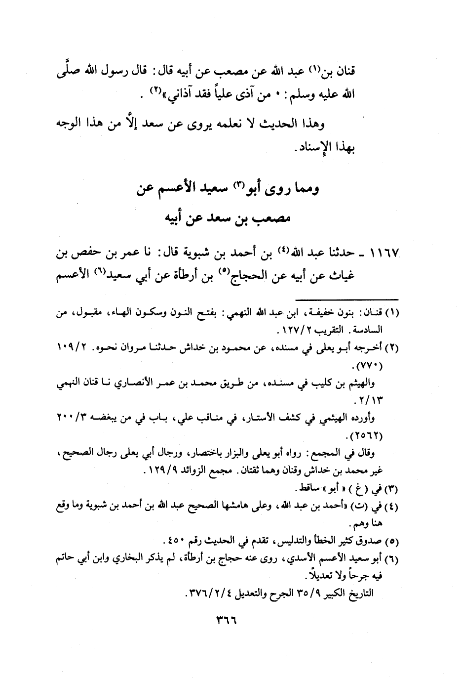 1167 - حَدَّثَنَا عَبْدُ اللَّهِ بْنُ أَحْمَدَ بْنِ شَبَّوَيْهِ، قَالَ: نا عُمَرُ بْنُ حَفْصِ بْنِ غِيَاثٍ، عَنْ أَبِيهِ، عَنِ الْحَجَّاجِ بْنِ أَرْطَأَةَ، عَنْ أَبِي سَعِيدٍ الْأَعْسَمِ -[367]-، عَنْ مُصْعَبِ بْنِ سَعْدٍ، عَنْ أَبِيهِ، أَنَّ رَسُولَ اللَّهِ صَلَّى اللهُ عَلَيْهِ وَسَلَّمَ: §رَأَى رَجُلًا يَنْشُدُ ضَالَّةَ فِي الْمَسْجِدِ فَقَالَ: «لَا وَجَدْتَ» وَهَذَا الْحَدِيثُ لَا نَعْلَمُهُ يُرْوَى عَنْ سَعْدٍ إِلَّا بِهَذَا الْإِسْنَادِ