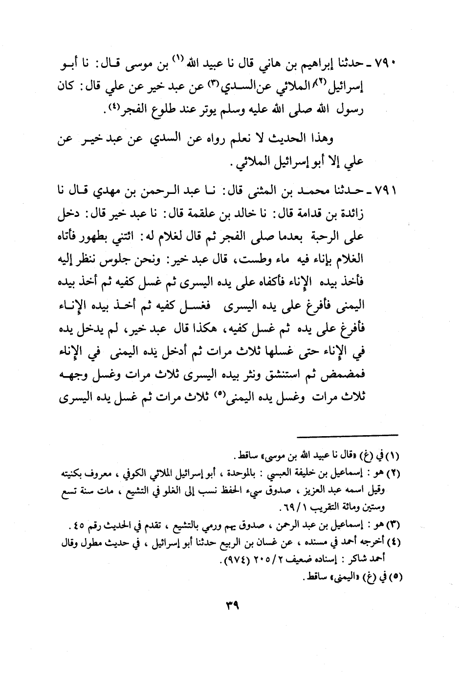791 - حَدَّثَنَا مُحَمَّدُ بْنُ الْمُثَنَّى، قَالَ: نا عَبْدُ الرَّحْمَنِ بْنُ مَهْدِيٍّ، قَالَ: نا زَائِدَةُ بْنُ قُدَامَةَ، قَالَ: نا خَالِدُ بْنُ عَلْقَمَةَ، قَالَ: نا عَبْدُ خَيْرٍ، قَالَ: دَخَلَ عَلِيٌّ الرَّحَبَةَ بَعْدَمَا صَلَّى الْفَجْرَ ثُمَّ قَالَ: لِغُلَامٍ لَهُ ائْتِنِي بِطَهُورٍ فَأَتَاهُ الْغُلَامُ بِإِنَاءٍ فِيهِ مَاءٌ وَطَسْتٍ، قَالَ: عَبْدُ خَيْرٍ: وَنَحْنُ جُلُوسٌ نَنْظُرُ إِلَيْهِ فَأَخَذَ بِيَدِهِ الْإِنَاءَ فَأَكْفَاهُ عَلَى يَدِهِ الْيُسْرَى، ثُمَّ غَسَلَ كَفَّيْهِ ثُمَّ أَخَذَ بِيَدِهِ الْيُمْنَى فَأَفْرَغَ عَلَى يَدِهِ الْيُسْرَى فَغَسَلَ كَفَّيْهِ، ثُمَّ أَخَذَ بِيَدِهِ الْإِنَاءَ فَأَفْرَغَ عَلَى يَدِهِ ثُمَّ غَسَلَ كَفَّيْهِ هَكَذَا، قَالَ عَبْدُ خَيْرٍ: §لَمْ يُدْخِلْ يَدَهُ فِي الْإِنَاءِ حَتَّى غَسَلَهَا ثَلَاثَ مَرَّاتٍ، ثُمَّ أَدْخَلَ يَدَهُ الْيُمْنَى فِي الْإِنَاءِ فَمَضْمَضَ ثُمَّ اسْتَنْشَقَ وَنَثَرَ بِيَدِهِ الْيُسْرَى ثَلَاثَ مَرَّاتٍ، وَغَسَلَ وَجْهَهُ ثَلَاثَ مَرَّاتٍ، وَغَسَلَ يَدَهُ الْيُمْنَى ثَلَاثَ مَرَّاتٍ ثُمَّ غَسَلَ يَدَهُ الْيُسْرَى -[40]- ثَلَاثَ مَرَّاتٍ، إِلَى الْمِرْفَقِ ثُمَّ أَدْخَلَ يَدَهُ الْإِنَاءَ حَتَّى غَمَرَهَا الْمَاءُ ثُمَّ رَفَعَهَا بِمَا حَمَلَتْ مِنَ الْمَاءِ فَمَسَحَهَا بِيَدِهِ الْيُسْرَى ثُمَّ مَسَحَ رَأْسَهُ بِيَدَيْهِ كِلْتَيْهِمَا مَرَّةً وَاحِدَةً ثُمَّ أَخَذَ بِيَدِهِ الْيُمْنَى فَصَبَّ عَلَى قَدَمِهِ الْيُمْنَى ثُمَّ غَسَلَهَا بِيَدِهِ الْيُسْرَى ثَلَاثَ مَرَّاتٍ، ثُمَّ أَخَذَ بِكَفِّهِ الْيُمْنَى فَصَبَّ عَلَى قَدَمِهِ الْيُسْرَى ثُمَّ غَسَلَهَا بِيَدِهِ الْيُسْرَى ثَلَاثَ مَرَّاتٍ، ثُمَّ أَخَذَ بِكَفِّهِ فَشَرِبَ مِنْهُ ثُمَّ قَالَ: مَنْ سَرَّهُ أَنْ يَنْظُرَ إِلَى طَهُورِ نَبِيِّ اللَّهِ فَهَذَا طَهُورُ نَبِيِّ اللَّهِ صَلَّى اللهُ عَلَيْهِ وَسَلَّمَ وَهَذَا الْحَدِيثُ قَدْ رَوَاهُ -[41]- غَيْرُ وَاحِدٍ عَنْ خَالِدِ بْنِ عَلْقَمَةَ عَنْ عَبْدِ خَيْرٍ، عَنْ عَلِيٍّ، وَلَا نَعْلَمُ أَحَدًا أَحْسَنُ لَهُ سِيَاقًا، وَلَا أَتَمُّ كَلَامًا مِنْ زَائِدَةَ وَقَدْ رُوِيَ عَنِ النَّبِيِّ صَلَّى اللهُ عَلَيْهِ وَسَلَّمَ، فِي الْوُضُوءِ ثَلَاثًا عَنْ عُثْمَانَ بْنِ عَفَّانَ، وَعَنْ أَبِي هُرَيْرَةَ، وَعَنْ أَنَسِ بْنِ مَالِكٍ، وَعَنِ ابْنِ عُمَرَ، وَعَنْ عَبْدِ اللَّهِ بْنِ عَمْرٍو، وَعَنِ الْبَرَاءِ بْنِ عَازِبٍ، وَعَنِ الْمِقْدَامِ بْنِ مَعْدِي كَرِبَ، وَعَنْ مُعَاوِيَةَ وَعَنْ غَيْرِهِمْ