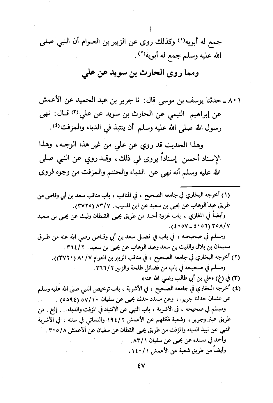 801 - حَدَّثَنَا يُوسُفُ بْنُ مُوسَى، قَالَ: نا جَرِيرُ بْنُ عَبْدِ الْحَمِيدِ، عَنِ الْأَعْمَشِ، عَنْ إِبْرَاهِيمَ التَّيْمِيِّ، عَنِ الْحَارِثِ بْنِ سُوَيْدٍ، عَنْ عَلِيٍّ، قَالَ: نَهَى رَسُولُ اللَّهِ صَلَّى اللهُ عَلَيْهِ وَسَلَّمَ، §أَنْ يُنْتَبَذَ فِي الدُّبَّاءِ وَالْمُزَفَّتِ " وَهَذَا الْحَدِيثُ قَدْ رُوِيَ عَنْ عَلِيٍّ مِنْ غَيْرِ هَذَا الْوَجْهِ، وَهَذَا الْإِسْنَادُ أَحْسَنُ إِسْنَادًا يُرْوَى فِي ذَلِكَ وَقَدْ رُوِيَ، عَنِ النَّبِيِّ صَلَّى اللهُ عَلَيْهِ وَسَلَّمَ، أَنَّهُ نَهَى عَنِ الدُّبَّاءِ، وَالْحَنْتَمِ، وَالْمُزَفَّتِ، مِنْ وُجُوهٍ فَرَوَى -[48]- ذَلِكَ ابْنُ عُمَرَ، وَجَابِرٌ وَأَنَسٌ، وَأَبُو سَعِيدٍ، وَأَبُو هُرَيْرَةَ، وَبُرَيْدَةُ، وَعَائِشَةُ وَغَيْرُهُمْ