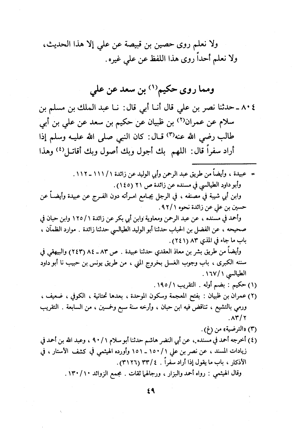 804 - حَدَّثَنَا نَصْرُ بْنُ عَلِيٍّ، قَالَ: أنا أَبِي قَالَ،: نا عَبْدُ الْمَلِكِ بْنُ مُسْلِمِ بْنِ سَلَّامٍ، عَنْ عِمْرَانَ بْنِ ظَبْيَانَ، عَنْ حُكَيْمِ بْنِ سَعْدٍ، عَنْ عَلِيِّ بْنِ أَبِي طَالِبٍ، رَضِيَ اللَّهُ عَنْهُ قَالَ: كَانَ النَّبِيُّ صَلَّى اللهُ عَلَيْهِ وَسَلَّمَ، إِذَا أَرَادَ سَفَرًا قَالَ: §اللَّهُمَّ بِكَ أَجُولُ وَبِكَ أُصُولُ وَبِكَ أُقَاتِلُ. وَهَذَا -[50]- الْكَلَامُ لَا نَعْلَمُهُ يُرْوَى عَنْ عَلِيٍّ إِلَّا مِنْ هَذَا الْوَجْهِ بِهَذَا الْإِسْنَادِ وَلَا نَعْلَمُ أَسْنَدَ حُكَيْمُ بْنُ سَعْدٍ عَنْ عَلِيٍّ غَيْرَ هَذَا الْحَدِيثِ