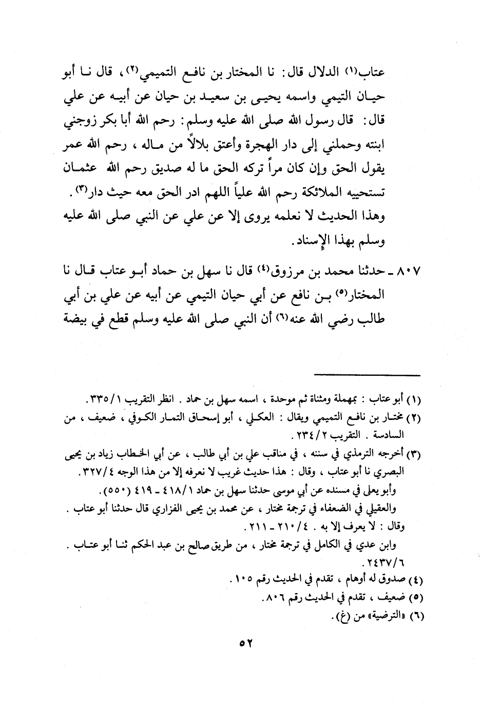 807 - حَدَّثَنَا مُحَمَّدُ بْنُ مَرْزُوقٍ، قَالَ: نا سَهْلُ بْنُ حَمَّادٍ أَبُو عَتَّابٍ، قَالَ: نا الْمُخْتَارُ بْنُ نَافِعٍ، عَنْ أَبِي حَيَّانَ التَّيْمِيِّ، عَنْ أَبِيهِ، عَنْ عَلِيِّ بْنِ أَبِي طَالِبٍ، رَضِيَ اللَّهُ عَنْهُ، أَنَّ النَّبِيَّ صَلَّى اللهُ عَلَيْهِ وَسَلَّمَ، §قَطَعَ فِي بَيْضَةٍ -[53]- مِنْ حَدِيدٍ قِيمَتُهَا أَحَدٌ وَعِشْرُونَ دِرْهَمًا " وَهَكَذَا حَدَّثَنَا بِهِ مُحَمَّدُ بْنُ مَرْزُوقٍ، عَنْ أَبِي عَتَّابٍ، عَنِ الْمُخْتَارِ، عَنْ أَبِي حَيَّانَ، عَنْ أَبِيهِ، عَنْ عَلِيٍّ، وَرَوَاهُ غَيْرُهُ عَنِ الْمُخْتَارِ، عَنْ أَبِي مَطَرٍ، عَنْ عَلِيِّ بْنِ أَبِي طَالِبٍ رَضِيَ اللَّهُ عَنْهُ