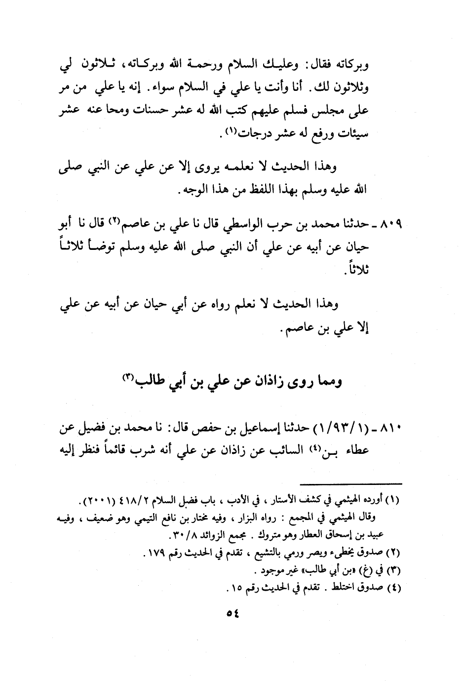 810 - حَدَّثَنَا إِسْمَاعِيلُ بْنُ حَفْصٍ، قَالَ: نا مُحَمَّدُ بْنُ فُضَيْلٍ، عَنْ عَطَاءِ بْنِ السَّائِبِ، عَنْ زَاذَانَ، عَنْ عَلِيٍّ، أَنَّهُ شَرِبَ قَائِمًا فَنَظَرَ إِلَيْهِ -[55]- النَّاسُ فَأَنْكَرُوا ذَلِكَ فَقَالَ عَلِيٌّ: §مَا تُنْكِرُونَ أَنْ أَشْرَبَ قَائِمًا فَقَدْ رَأَيْتُ رَسُولَ اللَّهِ صَلَّى اللهُ عَلَيْهِ وَسَلَّمَ يَشْرَبُ قَائِمًا
