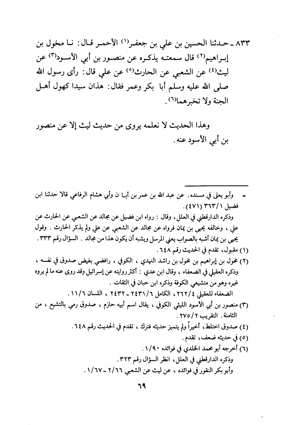 833 - حَدَّثَنَا الْحُسَيْنُ بْنُ عَلِيِّ بْنِ جَعْفَرٍ الْأَحْمَرُ، قَالَ: نا مُخَوَّلُ بْنُ إِبْرَاهِيمَ، قَالَ: سَمِعْتُهُ يَذْكُرُهُ عَنْ مَنْصُورِ بْنِ أَبِي الْأَسْوَدِ، عَنْ لَيْثٍ، عَنِ الشَّعْبِيِّ، عَنِ الْحَارِثِ، عَنْ عَلِيٍّ، قَالَ: رَأَى رَسُولُ اللَّهِ صَلَّى اللهُ عَلَيْهِ وَسَلَّمَ: أَبَا بَكْرٍ، وَعُمَرَ فَقَالَ: «§هَذَانِ سَيِّدَا كُهُولِ أَهْلِ الْجَنَّةِ وَلَا تُخْبِرْهُمَا» وَهَذَا الْحَدِيثُ لَا نَعْلَمُهُ يُرْوَى مِنْ حَدِيثِ لَيْثٍ، إِلَّا عَنْ مَنْصُورِ بْنِ أَبِي الْأَسْوَدِ عَنْهُ