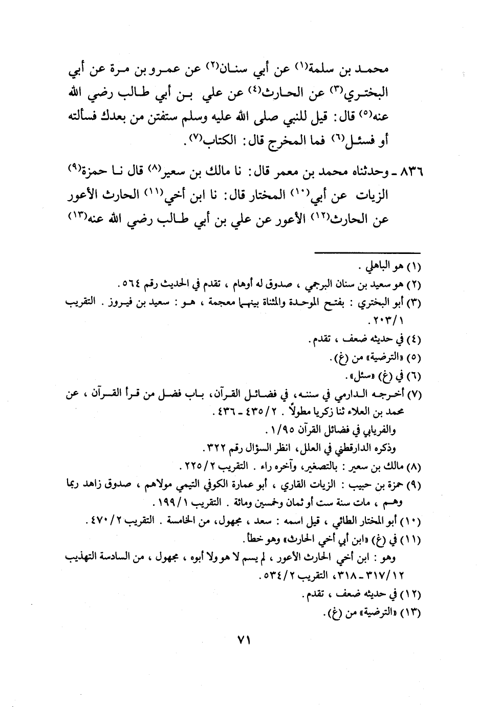 836 - وَحَدَّثَنَاهُ مُحَمَّدُ بْنُ مَعْمَرٍ، قَالَ: نا مَالِكُ بْنُ سُعَيْرٍ، قَالَ: نا حَمْزَةُ الزَّيَّاتُ، عَنْ أَبِي الْمُخْتَارِ، قَالَ: نا ابْنُ أَخِي الْحَارِثُ الْأَعْوَرُ، عَنِ الْحَارِثِ الْأَعْوَرِ، عَنْ عَلِيِّ بْنِ أَبِي طَالِبٍ، رَضِيَ اللَّهُ عَنْهُ -[72]-، يَتَقَارَبَانِ فِي حَدِيثِهِمَا وَاللَّفْظُ لَفْظُ ابْنِ أَخِي الْحَارِثِ، عَنِ الْحَارِثِ الْأَعْوَرِ، عَنْ عَلِيٍّ قَالَ: سَمِعْتُ رَسُولَ اللَّهِ صَلَّى اللهُ عَلَيْهِ وَسَلَّمَ يَقُولُ: " §إِنَّهَا سَتَكُونُ فِتْنَةٌ قَالَ: قُلْتُ فَمَا الْمَخْرَجُ مِنْهَا رَسُولَ اللَّهِ؟ قَالَ: " كِتَابُ اللَّهِ فِيهِ نَبَأُ مَا قَبْلَكُمْ وَخَبَرُ مَا بَعْدَكُمْ وَحُكْمُ مَا بَيْنَكُمْ، هُوَ الْفَصْلُ لَيْسَ بِالْهَزْلِ مَنْ يَرُدَّهُ مِنْ جَبَّارٍ قَصَمَهُ اللَّهُ، وَمَنِ ابْتَغَى الْهُدَى فِي غَيْرِهِ أَضَلَّهُ اللَّهُ هُوَ حَبْلُ اللَّهِ الْمَتِينُ وَالذَّكَرُ الْحَكِيمُ، وَهُوَ الصِّرَاطُ الْمُسْتَقِيمُ الَّذِي لَا تَزِيغُ بِهِ الْأَهْوَاءُ وَلَا تَشْبَعُ مِنْهُ الْعُلَمَاءُ وَلَا يَخْلُقُ عَنْ رَدٍّ، وَلَا تَنْقَضِي عَجَائِبُهُ، وَهُوَ الَّذِي لَمْ تَنْتَهِ الْجِنُّ حِينَ سَمِعَتْهُ أَنْ قَالُوا: إِنَّا سَمِعْنَا قُرْآنًا عَجَبًا، مَنْ قَالَ بِهِ صَدَقَ وَمَنْ عَمِلَ بِهِ أُجِرَ وَمَنْ حَكَمَ بِهِ عَدَلَ وَمَنْ دُعِيَ إِلَيْهِ هُدِيَ إِلَى صِرَاطٍ مُسْتَقِيمٍ وَمَنِ اعْتَصَمَ بِهِ هُدِيَ إِلَى صِرَاطٍ مُسْتَقِيمٍ -[73]- وَهَذَا الْحَدِيثُ لَا نَعْلَمُهُ يُرْوَى إِلَّا عَنْ عَلِيٍّ، وَلَا نَعْلَمُ رَوَاهُ عَنْ عَلِيٍّ، إِلَّا الْحَارِثُ