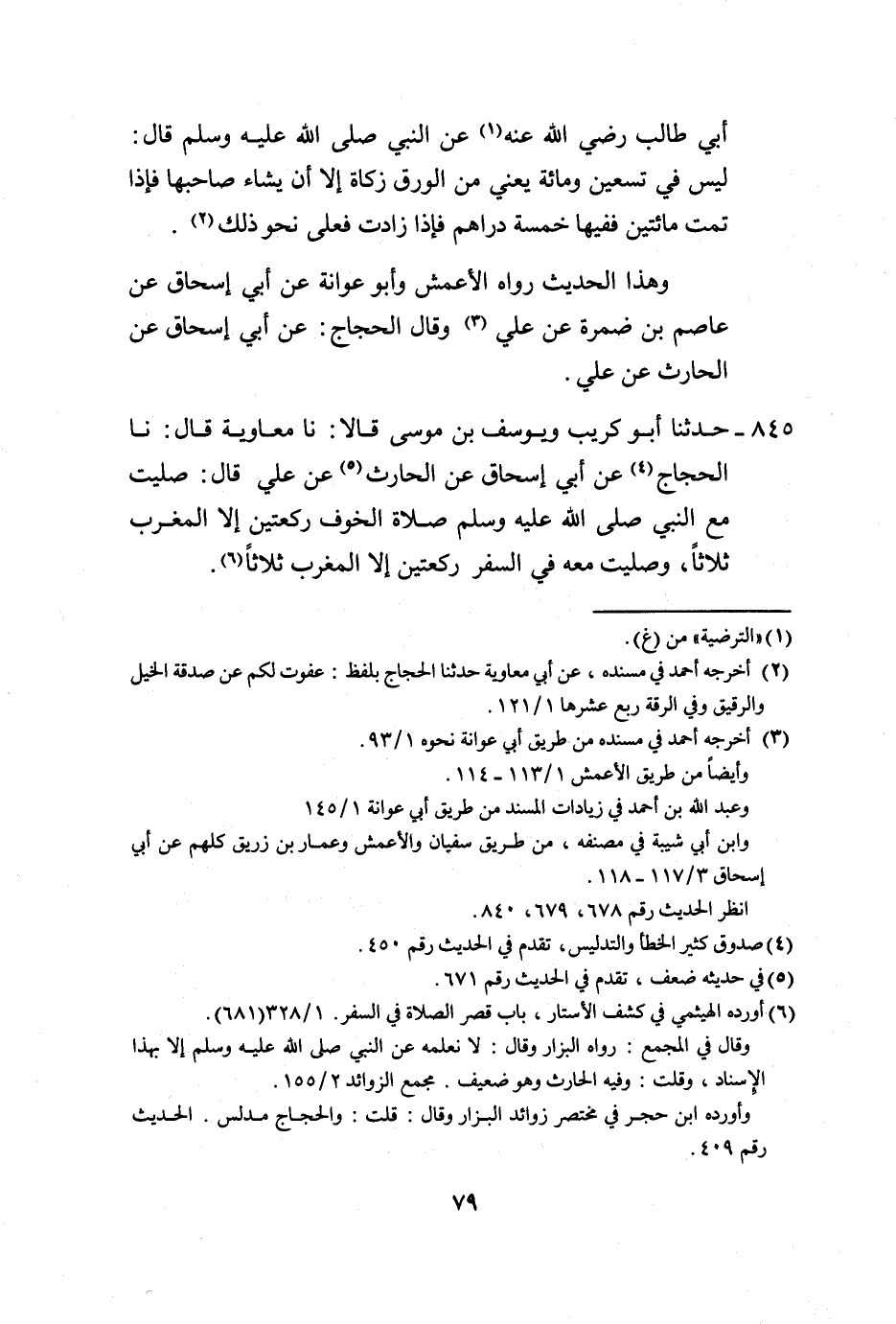 845 - حَدَّثَنَا أَبُو كُرَيْبٍ، وَيُوسُفُ بْنُ مُوسَى، قَالَا: نا مُعَاوِيَةُ، قَالَ: نا الْحَجَّاجُ، عَنْ أَبِي إِسْحَاقَ، عَنِ الْحَارِثِ، عَنْ عَلِيٍّ، قَالَ: صَلَّيْتُ مَعَ النَّبِيِّ صَلَّى اللهُ عَلَيْهِ وَسَلَّمَ: §صَلَاةَ الْخَوْفِ رَكْعَتَيْنِ إِلَّا الْمَغْرِبَ ثَلَاثًا، وَصَلَّيْتُ مَعَهُ فِي السَّفَرِ رَكْعَتَيْنِ إِلَّا الْمَغْرِبَ ثَلَاثًا -[80]-. وَهَذَا الْحَدِيثُ لَا نَعْلَمُهُ يُرْوَى عَنِ النَّبِيِّ صَلَّى اللهُ عَلَيْهِ وَسَلَّمَ: إِلَّا بِهَذَا الْإِسْنَادِ مِنْ رِوَايَةَ عَلِيٍّ عَنْهُ