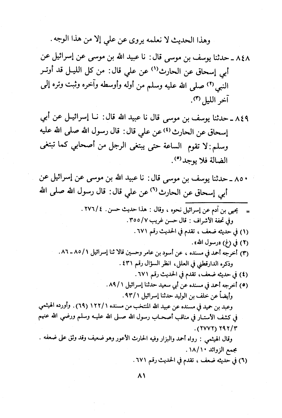 848 - حَدَّثَنَا يُوسُفُ بْنُ مُوسَى، قَالَ: نا عُبَيْدُ اللَّهِ بْنُ مُوسَى، عَنْ إِسْرَائِيلَ، عَنْ أَبِي إِسْحَاقَ، عَنِ الْحَارِثِ، عَنْ عَلِيٍّ، قَالَ: مِنْ كُلِّ اللَّيْلِ قَدْ أَوْتَرَ النَّبِيُّ صَلَّى اللهُ عَلَيْهِ وَسَلَّمَ: §مِنْ أَوَّلِهِ وَأَوْسَطِهِ وَآخِرِهِ وَثَبِّتْ وِتْرَهُ إِلَى آخِرِ اللَّيْلِ