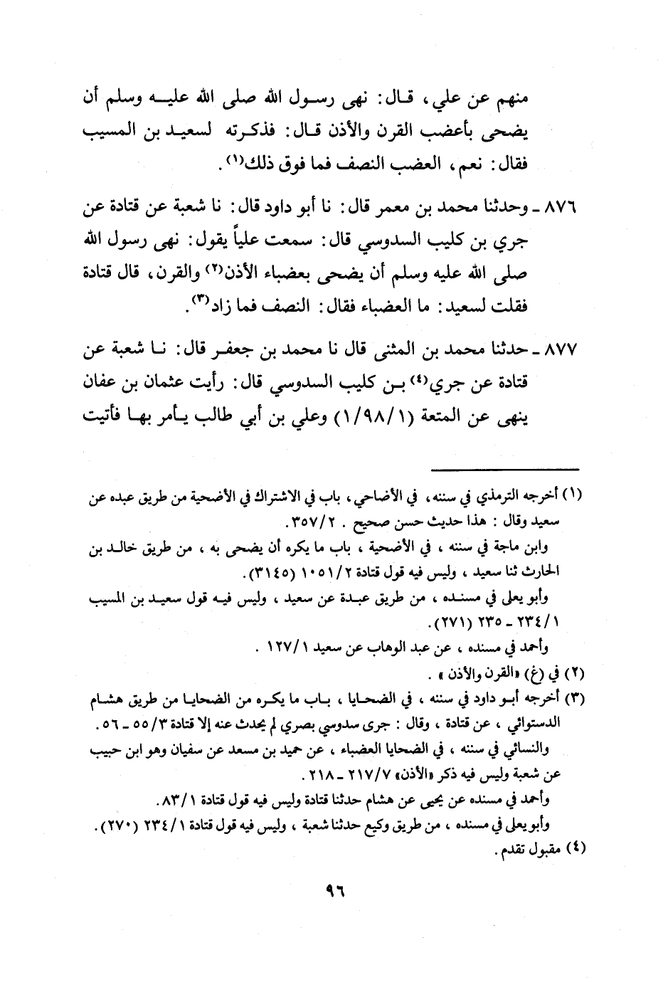 876 - وَحَدَّثَنَا مُحَمَّدُ بْنُ مَعْمَرٍ، قَالَ: نا أَبُو دَاوُدَ، قَالَ: نا شُعْبَةُ، عَنْ قَتَادَةَ، عَنْ جُرَيِّ بْنِ كُلَيْبٍ السَّدُوسِيِّ، قَالَ: سَمِعْتُ عَلِيًّا، يَقُولُ نَهَى رَسُولُ اللَّهِ صَلَّى اللهُ عَلَيْهِ وَسَلَّمَ: أَنْ يُضَحَّى بِعَضْبَاءِ الْأُذُنِ وَالْقَرْنِ قَالَ: قَتَادَةُ فَقُلْتُ لِسَعِيدٍ: مَا الْعَضْبَاءُ؟ فَقَالَ: §النِّصْفُ فَمَا زَادَ