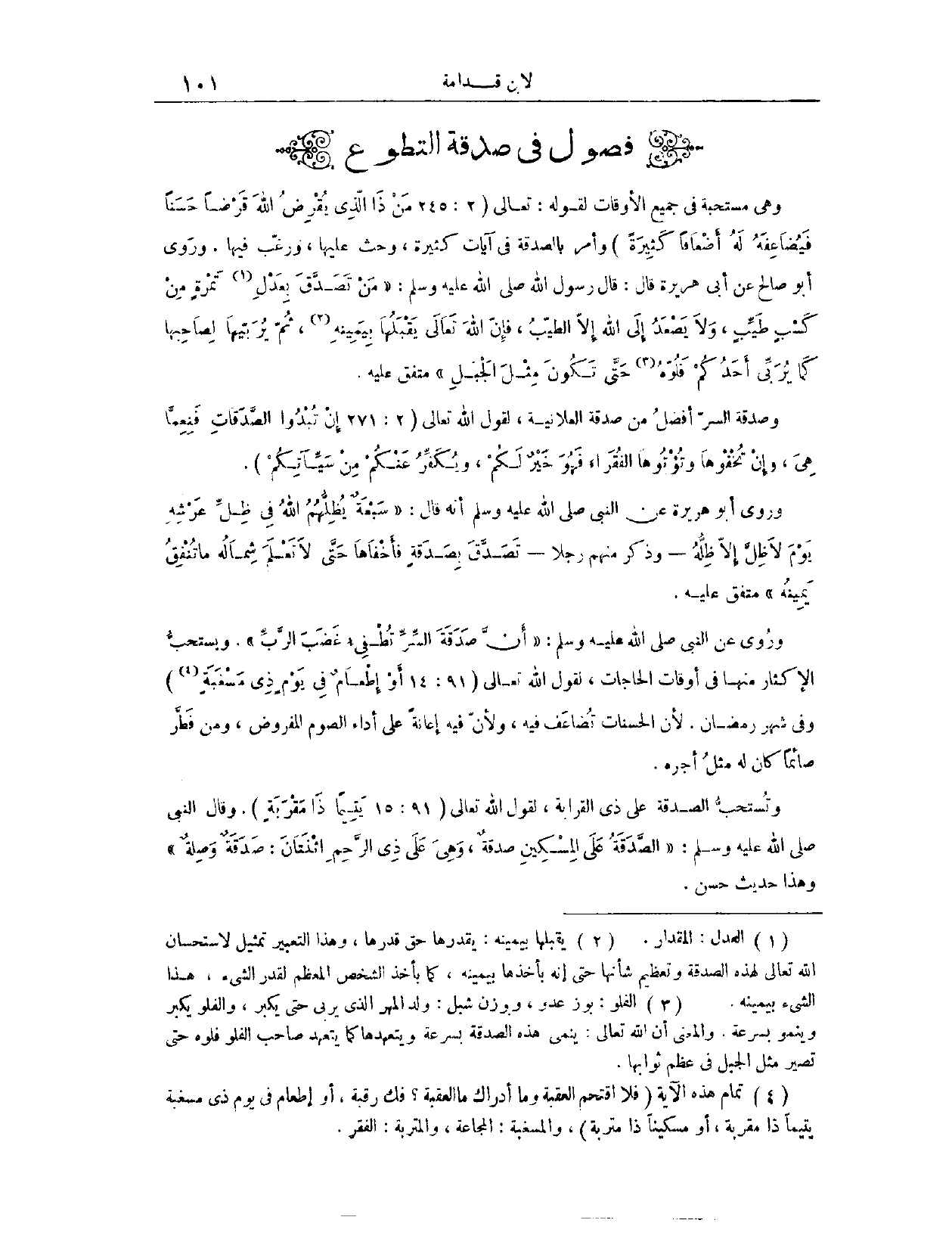 ِ: (١٩٩٦) فَصْلُ وَهِيَ مُسْتَحَبَّةٌ فِي جَمِيعِ الْأَوْقَاتِ؛ لِقَوْلِهِ تَعَالَى: {مَنْ ذَا الَّذِي يُقْرِضُ اللَّهَ قَرْضًا حَسَنًا فَيُضَاعِفَهُ لَهُ أَضْعَافًا كَثِيرَةً} [البقرة: ٢٤٥] . وَأَمَرَ بِالصَّدَقَةِ فِي آيَاتٍ كَثِيرَةِ، وَحَثَّ عَلَيْهَا وَرَغَّبَ فِيهَا. وَرَوَى أَبُو صَالِحٍ، عَنْ أَبِي هُرَيْرَةَ، قَالَ: قَالَ رَسُولُ اللَّهِ - صَلَّى اللَّهُ عَلَيْهِ وَسَلَّمَ - «مَنْ تَصَدَّقَ بِعَدْلِ تَمْرَةٍ مِنْ كَسْبٍ طَيِّبٍ وَلَا يَصْعَدُ إلَى اللَّهِ إلَّا الطَّيِّبُ، فَإِنَّ اللَّهَ تَعَالَى يَقْبَلُهَا بِيَمِينِهِ، ثُمَّ يُرَبِّيهَا لِصَاحِبِهَا، كَمَا يُرَبِّي أَحَدُكُمْ فَلُوَّهُ، حَتَّى تَكُونَ مِثْلَ الْجَبَلِ» . مُتَّفَقٌ عَلَيْهِ.