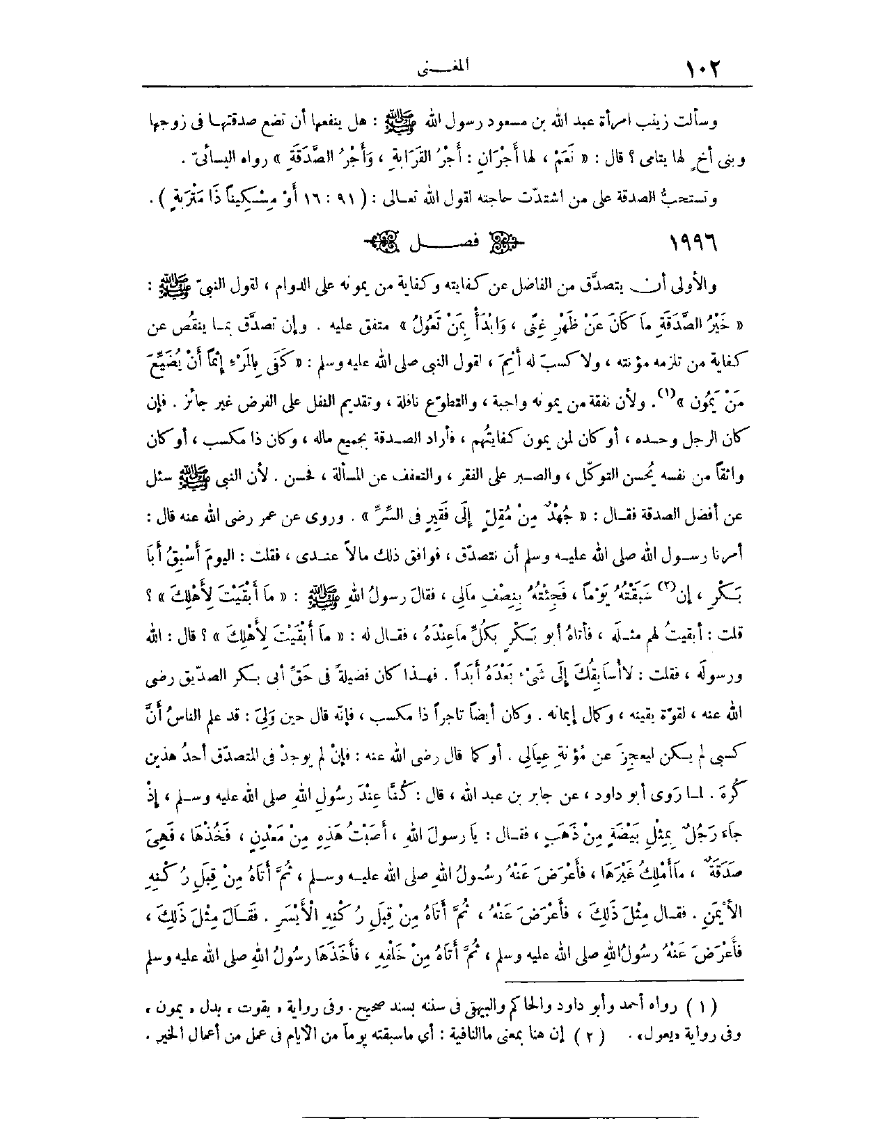 (١٩٩٧) فَصْلٌ: وَالْأَوْلَى أَنْ يَتَصَدَّقَ مِنْ الْفَاضِلِ عَنْ كِفَايَتِهِ، وَكِفَايَةِ مَنْ يَمُونُهُ عَلَى الدَّوَامِ؛ لِقَوْلِ النَّبِيِّ - صَلَّى اللَّهُ عَلَيْهِ وَسَلَّمَ -: «خَيْرُ الصَّدَقَةِ مَا كَانَ عَنْ ظَهْرِ غِنًى، وَابْدَأْ بِمَنْ تَعُولُ» مُتَّفَقٌ عَلَيْهِ،. فَإِنْ تَصَدَّقَ بِمَا يَنْقُصُ عَنْ كِفَايَةِ مَنْ تَلْزَمُهُ مُؤْنَتُهُ، وَلَا كَسْبَ لَهُ، أَثِمَ؛ لِقَوْلِ النَّبِيِّ - صَلَّى اللَّهُ عَلَيْهِ وَسَلَّمَ -: «كَفَى بِالْمَرْءِ إثْمًا أَنْ يُضَيِّعَ مَنْ يَمُونُ» . وَلِأَنَّ نَفَقَةَ مِنْ يَمُونُهُ وَاجِبَةٌ، وَالتَّطَوُّعَ نَافِلَةٌ، وَتَقْدِيمُ النَّفْلِ عَلَى الْفَرْضِ غَيْرُ جَائِزٍ فَإِنْ كَانَ الرَّجُلُ وَحْدَهُ أَوْ كَانَ لِمَنْ يُمَوَّنُ كِفَايَتُهُمْ فَأَرَادَ الصَّدَقَةَ بِجَمِيعِ مَالِهِ، وَكَانَ ذَا مَكْسَبٍ، أَوْ كَانَ وَاثِقًا مِنْ نَفْسِهِ، يُحْسِنُ التَّوَكُّلَ وَالصَّبْرَ عَلَى الْفَقْرِ، وَالتَّعَفُّفَ عَنْ الْمَسْأَلَةِ، فَحَسَنٌ؛ لِأَنَّ النَّبِيَّ - صَلَّى اللَّهُ عَلَيْهِ وَسَلَّمَ - «سُئِلَ عَنْ أَفْضَلِ الصَّدَقَةِ، فَقَالَ: جُهْدٌ مِنْ مُقِلٍّ إلَى فَقِيرٍ فِي السِّرِّ» . وَرُوِيَ عَنْ عُمَرَ - رَضِيَ اللَّهُ عَنْهُ - قَالَ: «أَمَرَنَا رَسُولُ اللَّهِ - صَلَّى اللَّهُ عَلَيْهِ وَسَلَّمَ - أَنْ نَتَصَدَّقَ، فَوَافَقَ ذَلِكَ مَالًا عِنْدِي، فَقُلْت الْيَوْمَ أَسْبِقُ أَبَا بَكْرٍ إنْ سَبَقْتُهُ يَوْمًا، فَجِئْتُهُ بِنِصْفِ مَالِي، فَقَالَ رَسُولُ اللَّهِ - صَلَّى اللَّهُ عَلَيْهِ وَسَلَّمَ - مَا أَبْقَيْتَ لِأَهْلِكَ؟ قُلْت: أَبْقَيْت لَهُمْ مِثْلَهُ، فَأَتَاهُ أَبُو بَكْرٍ بِكُلِّ مَا عِنْدَهُ، فَقَالَ لَهُ: مَا أَبْقَيْتَ لِأَهْلِكَ؟ قَالَ: اللَّهَ وَرَسُولَهُ فَقُلْت: لَا أُسَابِقُكَ إلَى شَيْءٍ بَعْدَهُ أَبَدًا» .