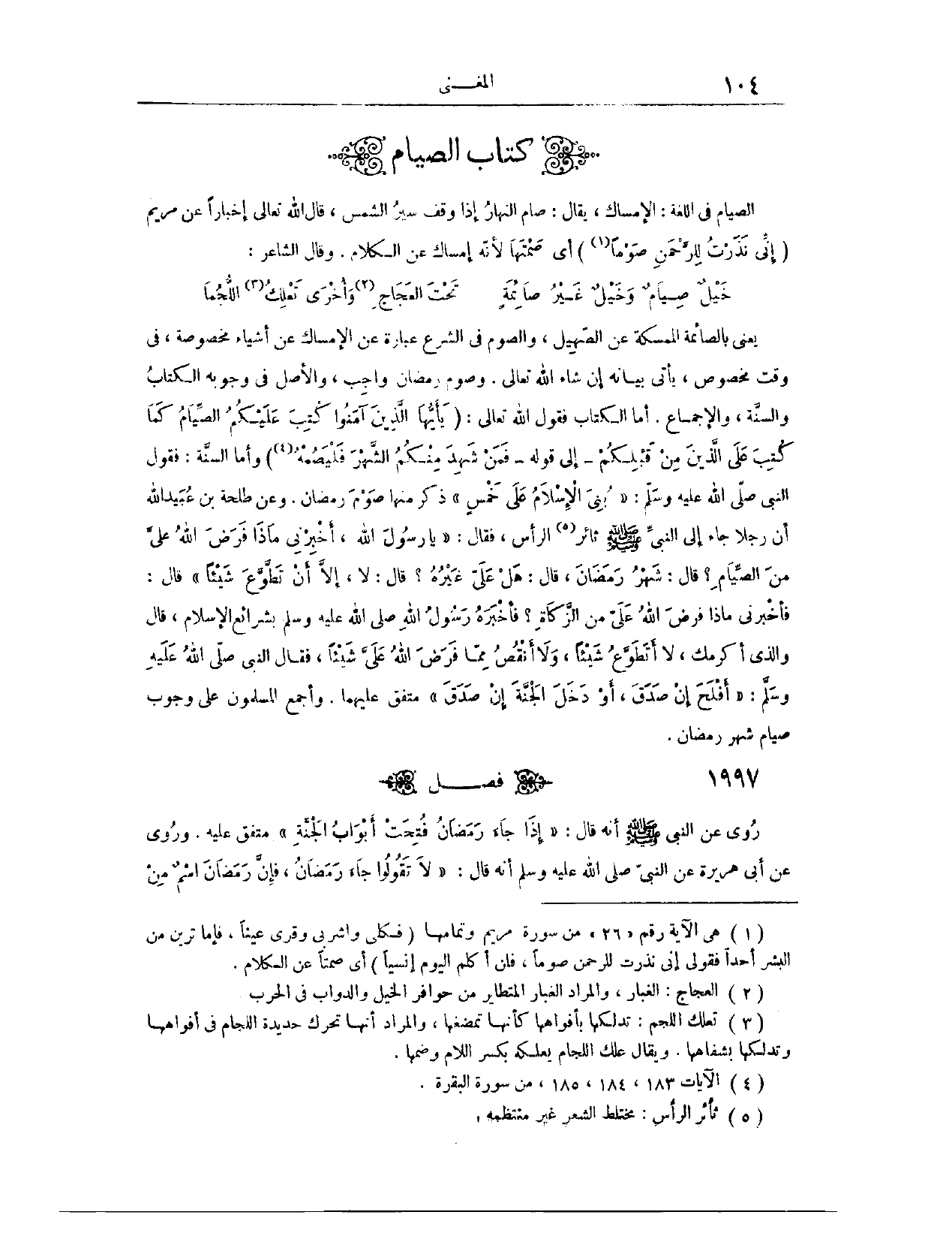 الصِّيَامُ فِي اللُّغَةِ: الْإِمْسَاكُ، يُقَالُ: صَامَ النَّهَارُ. إذَا وَقَفَ سَيْرُ الشَّمْسِ. قَالَ اللَّهُ تَعَالَى إخْبَارًا عَنْ مَرْيَمَ: {إِنِّي نَذَرْتُ لِلرَّحْمَنِ صَوْمًا} [مريم: ٢٦] . أَيْ صَمْتًا؛ لِأَنَّهُ إمْسَاكٌ عَنْ الْكَلَامِ، وَقَالَ الشَّاعِرُ: