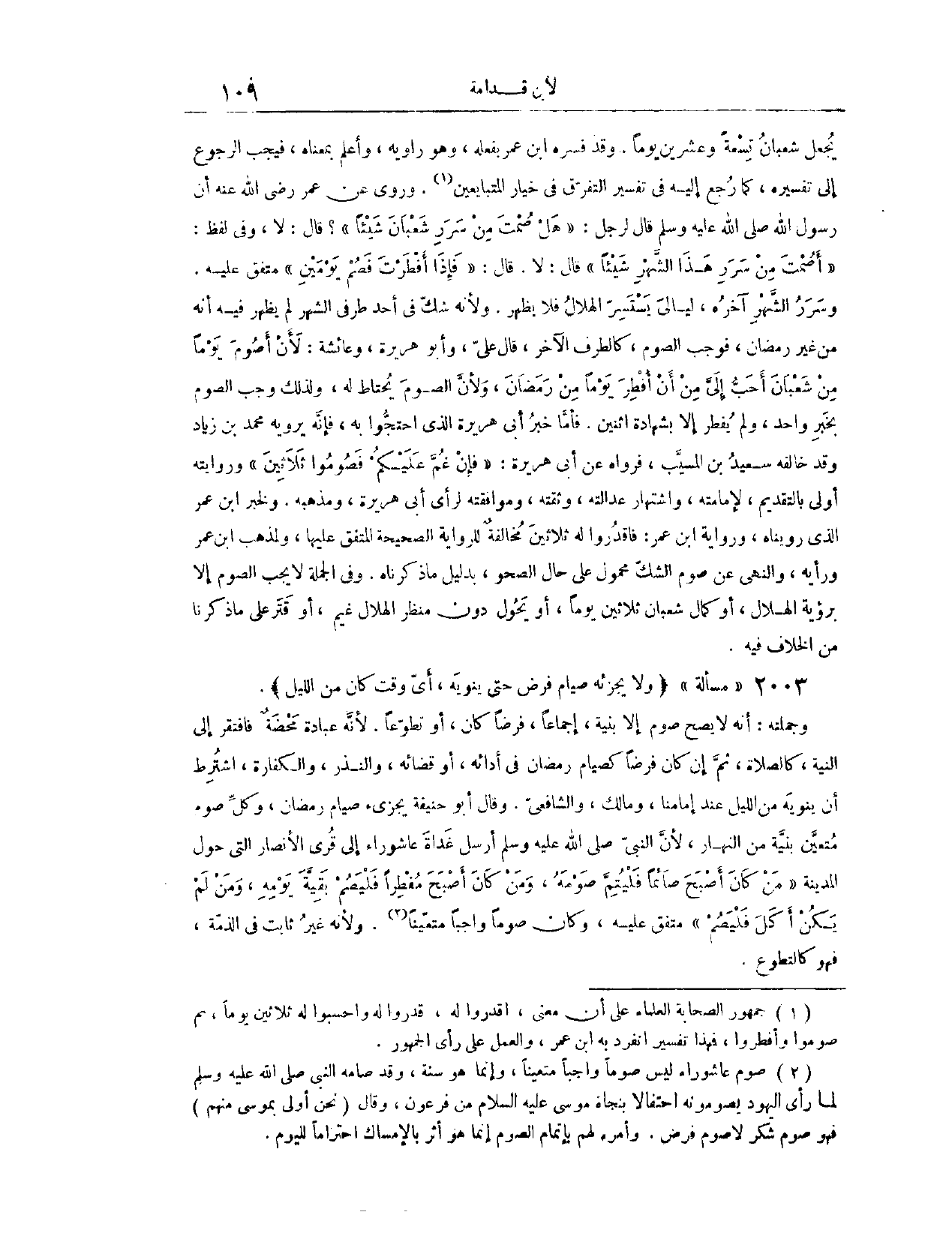 (٢٠٠٤) مَسْأَلَةٌ: قَالَ: (وَلَا يُجْزِئُهُ صِيَامُ فَرْضٍ حَتَّى يَنْوِيَهُ أَيَّ وَقْتٍ كَانَ مِنْ اللَّيْلِ) وَجُمْلَتُهُ أَنَّهُ لَا يَصِحُّ صَوْمٌ إلَّا بِنِيَّةٍ. إجْمَاعًا، فَرْضًا كَانَ أَوْ تَطَوُّعًا، لِأَنَّهُ عِبَادَةٌ مَحْضَةٌ، فَافْتَقَرَ إلَى النِّيَّةِ، كَالصَّلَاةِ، ثُمَّ إنْ كَانَ فَرْضًا كَصِيَامِ رَمَضَانَ فِي أَدَائِهِ أَوْ قَضَائِهِ، وَالنَّذْرِ وَالْكَفَّارَةِ، اُشْتُرِطَ أَنْ يَنْوِيَهُ مِنْ اللَّيْلِ عِنْدَ إمَامِنَا وَمَالِكٍ، وَالشَّافِعِيِّ، وَقَالَ أَبُو حَنِيفَةَ: يُجْزِئُ صِيَامُ رَمَضَانَ وَكُلُّ صَوْمٍ مُتَعَيِّنٍ بِنِيَّةٍ مِنْ النَّهَارِ؛ لِأَنَّ النَّبِيَّ - صَلَّى اللَّهُ عَلَيْهِ وَسَلَّمَ - أَرْسَلَ غَدَاةَ عَاشُورَاءَ إلَى قُرَى الْأَنْصَارِ الَّتِي حَوْلَ الْمَدِينَةِ: «مَنْ كَانَ أَصْبَحَ صَائِمًا فَلْيُتِمَّ صَوْمَهُ، وَمَنْ كَانَ أَصْبَحَ مُفْطِرًا فَلْيَصُمْ بَقِيَّةَ يَوْمِهِ، وَمَنْ لَمْ يَكُنْ أَكَلَ فَلْيَصُمْ» . مُتَّفَقٌ عَلَيْهِ.