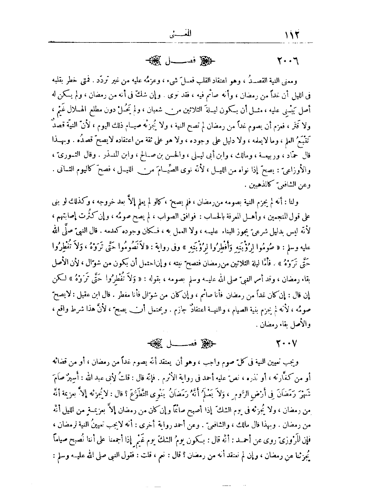 فَصْلٌ: وَمَعْنَى النِّيَّةِ الْقَصْدُ، وَهُوَ اعْتِقَادُ الْقَلْبِ فِعْلَ شَيْءٍ، وَعَزْمُهُ عَلَيْهِ، مِنْ غَيْرِ تَرَدُّدٍ، فَمَتَى خَطَرَ بِقَلْبِهِ فِي اللَّيْلِ أَنَّ غَدًا مِنْ رَمَضَانَ، وَأَنَّهُ صَائِمٌ فِيهِ، فَقَدْ نَوَى. وَإِنْ شَكَّ فِي أَنَّهُ مِنْ رَمَضَانَ وَلَمْ يَكُنْ لَهُ أَصْلٌ يَبْنِي عَلَيْهِ، مِثْلُ أَنْ يَكُونَ لَيْلَةَ الثَّلَاثِينَ مِنْ شَعْبَانَ، وَلَمْ يَحُلْ دُونَ مَطْلَعِ الْهِلَالِ غَيْمٌ وَلَا قَتَرٌ، فَعَزَمَ أَنْ يَصُومَ غَدًا مِنْ رَمَضَانَ، لَمْ تَصِحّ النِّيَّةُ، وَلَا يُجْزِئُهُ صِيَامُ ذَلِكَ الْيَوْمِ، لِأَنَّ النِّيَّةَ قَصْدٌ تَتْبَعُ الْعِلْمَ، وَمَا لَا يَعْلَمُهُ وَلَا دَلِيلَ عَلَى وُجُودِهِ وَلَا هُوَ عَلَى ثِقَةٍ مِنْ اعْتِقَادِهِ لَا يَصِحُّ قَصْدُهُ. وَبِهَذَا قَالَ حَمَّادٌ، وَرَبِيعَةُ، وَمَالِكٌ، وَابْنُ أَبِي لَيْلَى، وَالْحَسَنُ بْنُ صَالِحٍ، وَابْنُ الْمُنْذِرِ.
