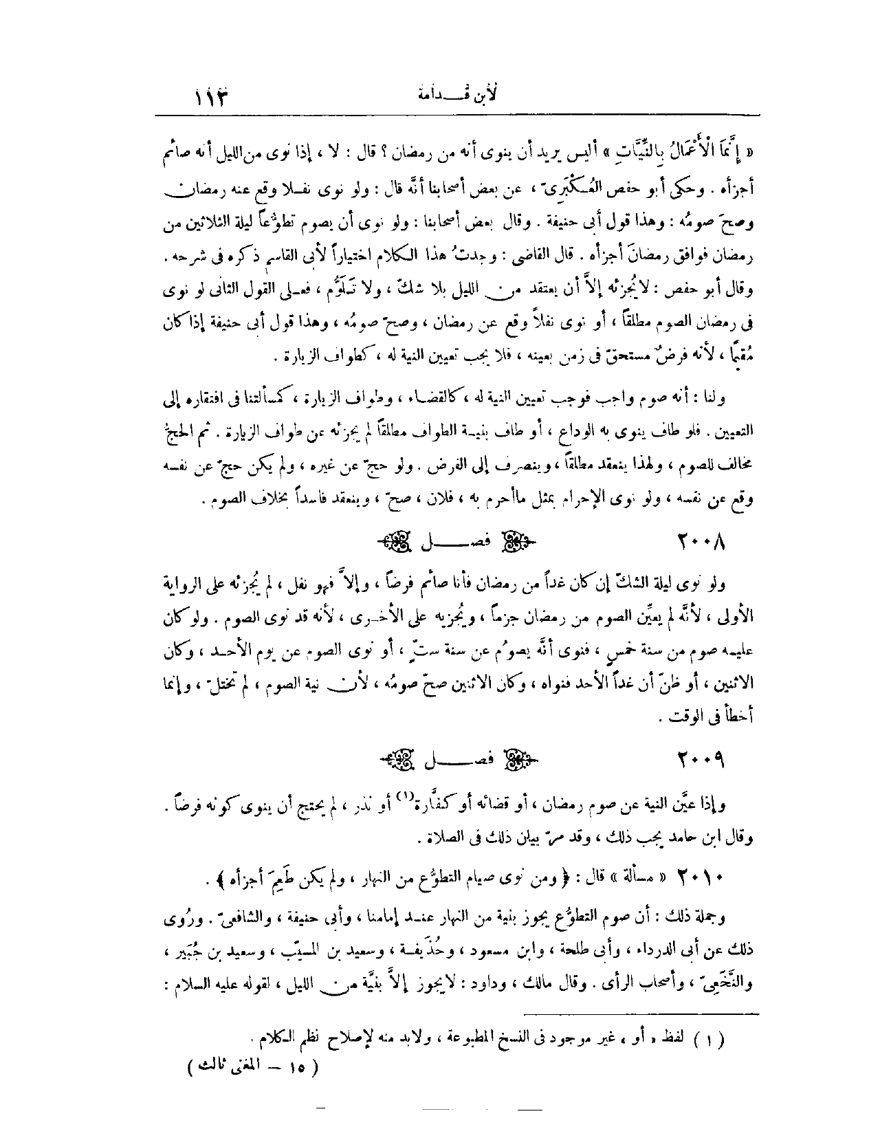 (٢٠١٠) فَصْلٌ: وَإِذَا عَيَّنَ النِّيَّةَ عَنْ صَوْمِ رَمَضَانَ، أَوْ قَضَائِهِ أَوْ كَفَّارَةٍ، أَوْ نَذْرٍ، لَمْ يَحْتَجْ أَنْ يَنْوِيَ كَوْنَهُ فَرْضًا. وَقَالَ ابْنُ حَامِدٍ: يَجِبُ ذَلِكَ. وَقَدْ مَرَّ بَيَانُ ذَلِكَ فِي الصَّلَاةِ.