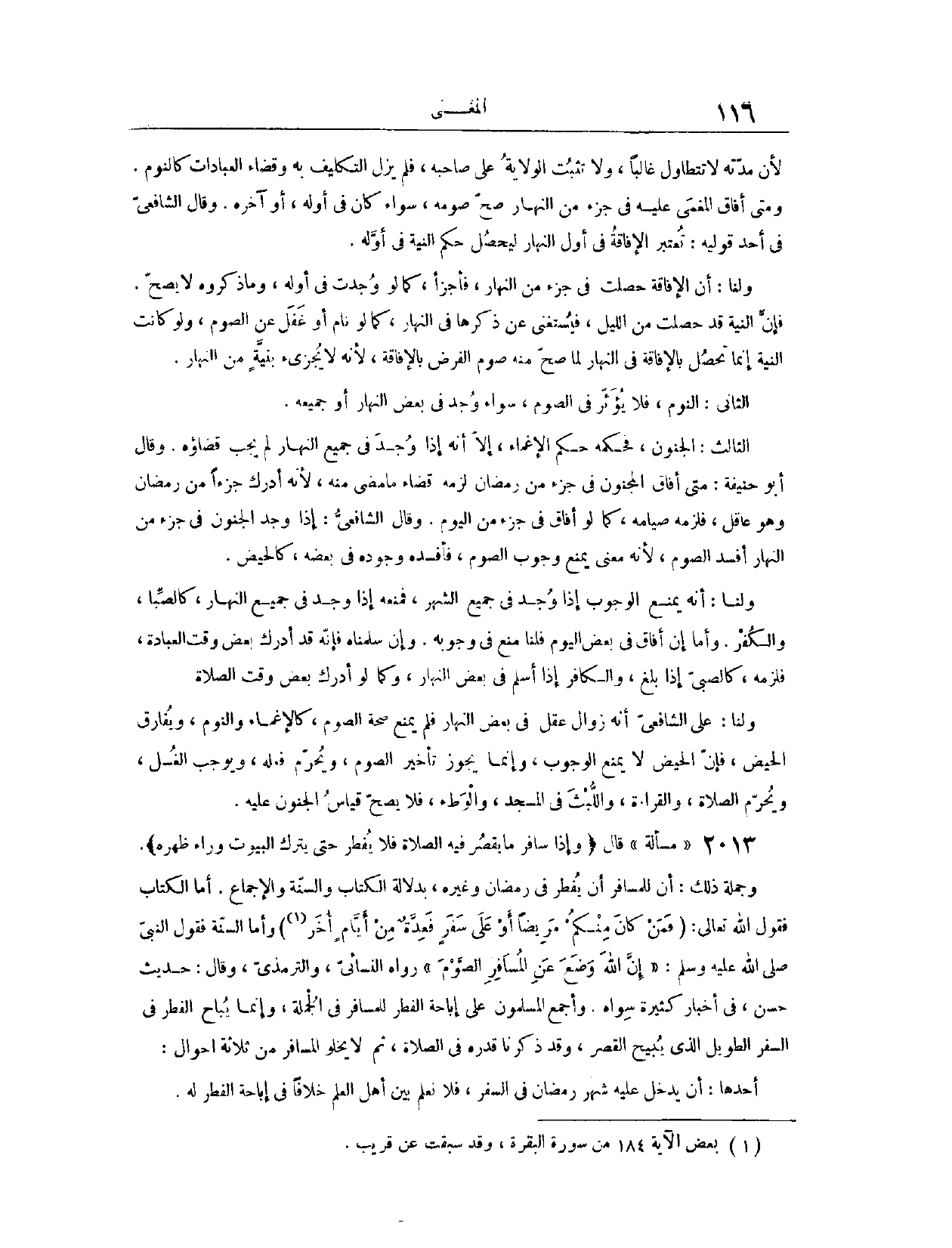 وَلَنَا أَنَّهُ مَعْنًى يَمْنَعُ الْوُجُوبَ إذَا وُجِدَ فِي جَمِيعِ الشَّهْرِ، فَمَنَعَهُ إذَا وُجِدَ فِي جَمِيعِ النَّهَارِ، كَالصِّبَا وَالْكُفْرِ، وَأَمَّا إنَّ أَفَاقَ فِي بَعْضِ الْيَوْمِ فَلَنَا مَنْعٌ فِي وُجُوبِهِ، وَإِنْ سَلَّمْنَاهُ فَإِنَّهُ قَدْ أَدْرَكَ بَعْضَ وَقْتِ الْعِبَادَةِ، فَلَزِمَهُ، كَالصَّبِيِّ إذَا بَلَغَ، وَالْكَافِرِ إذَا أَسْلَمَ فِي بَعْضِ النَّهَارِ، وَكَمَا لَوْ أَدْرَكَ بَعْضَ وَقْتِ الصَّلَاةِ. وَلَنَا عَلَى الشَّافِعِيِّ أَنَّهُ زَوَالُ عَقْلٍ فِي بَعْضِ النَّهَارِ، فَلَمْ يَمْنَعْ صِحَّةَ الصَّوْمِ، كَالْإِغْمَاءِ وَالنَّوْمِ، وَيُفَارِقُ الْحَيْضَ؛ فَإِنَّ الْحَيْضَ لَا يَمْنَعُ الْوُجُوبَ، وَإِنَّمَا يُجَوِّزُ تَأْخِيرَ الصَّوْمِ، وَيُحَرِّمُ فِعْلَهُ، وَيُوجِبُ الْغُسْلَ، وَيُحَرِّمُ الصَّلَاةَ وَالْقِرَاءَةَ وَاللُّبْثَ فِي الْمَسْجِدِ وَالْوَطْءَ، فَلَا يَصِحُّ قِيَاسُ الْجُنُونِ عَلَيْهِ.