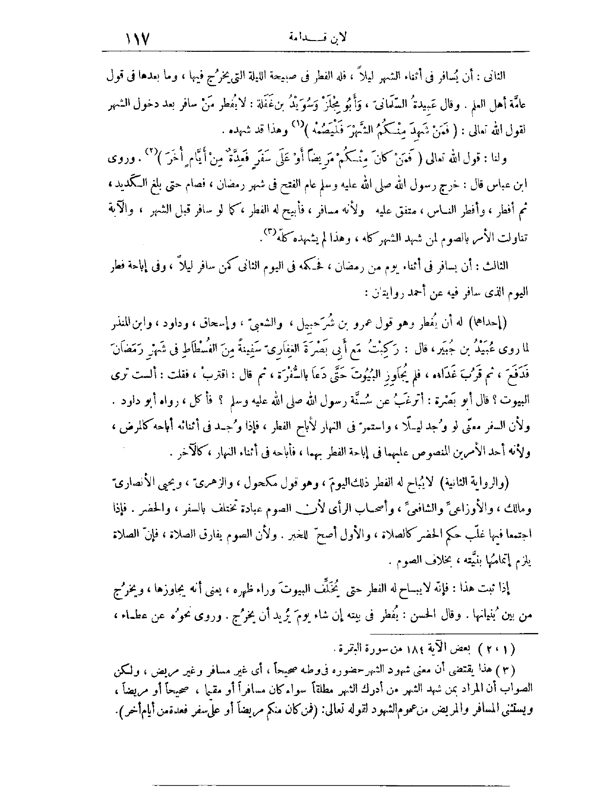 وَلَنَا قَوْلُ اللَّهِ تَعَالَى: {فَمَنْ كَانَ مِنْكُمْ مَرِيضًا أَوْ عَلَى سَفَرٍ فَعِدَّةٌ مِنْ أَيَّامٍ أُخَرَ} [البقرة: ١٨٤] . وَرَوَى ابْنُ عَبَّاسٍ، قَالَ: «خَرَجَ رَسُولُ اللَّهِ - صَلَّى اللَّهُ عَلَيْهِ وَسَلَّمَ - عَامَ الْفَتْحِ فِي شَهْرِ رَمَضَانَ، فَصَامَ حَتَّى بَلَغَ الْكَدِيدَ، ثُمَّ أَفْطَرَ وَأَفْطَرَ النَّاسُ» . مُتَّفَقٌ عَلَيْهِ. وَلِأَنَّهُ مُسَافِرٌ فَأُبِيحَ لَهُ الْفِطْرُ، كَمَا لَوْ سَافَرَ قَبْلَ الشَّهْرِ، وَالْآيَةُ تَنَاوَلَتْ الْأَمْرَ بِالصَّوْمِ لِمَنْ شَهِدَ الشَّهْرَ كُلَّهُ، وَهَذَا لَمْ يَشْهَدْهُ كُلَّهُ. الثَّالِثُ، أَنْ يُسَافِرَ فِي أَثْنَاءِ يَوْمٍ مِنْ رَمَضَانَ، فَحُكْمُهُ فِي الْيَوْمِ الثَّانِي كَمَنْ سَافَرَ لَيْلًا، وَفِي إبَاحَةِ فِطْرِ الْيَوْمِ الَّذِي سَافَرَ فِيهِ، عَنْ أَحْمَدَ رِوَايَتَانِ؛ إحْدَاهُمَا، لَهُ أَنْ يُفْطِرَ.