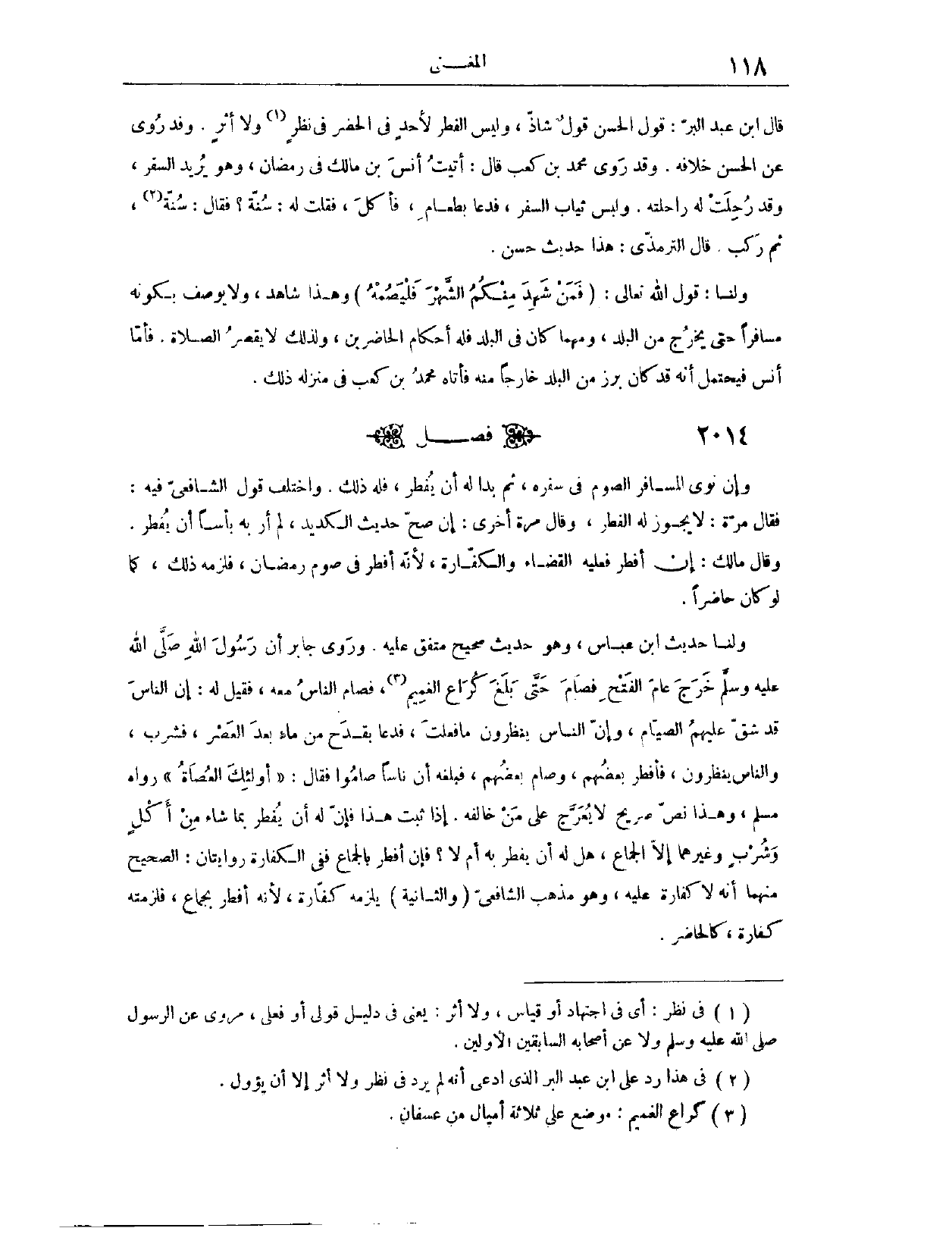 قَالَ ابْنُ عَبْدِ الْبَرِّ: قَوْلُ الْحَسَنِ قَوْلٌ شَاذٌّ، وَلَيْسَ الْفِطْرُ لِأَحَدٍ فِي الْحَضَرِ فِي نَظَرٍ وَلَا أَثَرٍ. وَقَدْ رُوِيَ عَنْ الْحَسَنِ خِلَافُهُ. وَقَدْ رَوَى مُحَمَّدُ بْنُ كَعْبٍ، قَالَ: «أَتَيْت أَنَسَ بْنَ مَالِكٍ فِي رَمَضَانَ، وَهُوَ يُرِيدُ السَّفَرَ، وَقَدْ رُحِّلَتْ لَهُ رَاحِلَتُهُ، وَلَبِسَ ثِيَابَ السَّفَرِ، فَدَعَا بِطَعَامٍ فَأَكَلَ، فَقُلْت لَهُ: سُنَّةٌ؟ فَقَالَ: سُنَّةٌ. ثُمَّ رَكِبَ.» قَالَ التِّرْمِذِيُّ: هَذَا حَدِيثٌ حَسَنٌ.