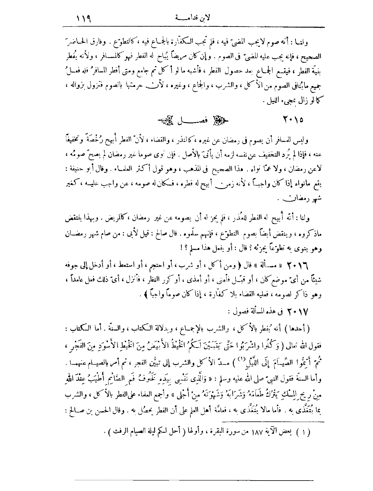 وَلَنَا أَنَّهُ صَوْمٌ لَا يَجِبُ الْمُضِيُّ فِيهِ، فَلَمْ تَجِبْ الْكَفَّارَةُ بِالْجِمَاعِ فِيهِ، كَالتَّطَوُّعِ، وَفَارَقَ الْحَاضِرَ الصَّحِيحَ، فَإِنَّهُ يَجِبُ عَلَيْهِ الْمُضِيُّ فِي الصَّوْمِ، وَإِنْ كَانَ مَرِيضًا يُبَاحُ لَهُ الْفِطْرُ فَهُوَ كَالْمُسَافِرِ، وَلِأَنَّهُ يُفْطِرُ بِنِيَّةِ الْفِطْرِ، فَيَقَعُ الْجِمَاعُ بَعْدَ حُصُولِ الْفِطْرِ، فَأَشْبَهَ مَا لَوْ أَكَلَ ثُمَّ جَامَعَ. وَمَتَى أَفْطَرَ الْمُسَافِرُ فَلَهُ فِعْلُ جَمِيعِ مَا يُنَافِي الصَّوْمَ، مِنْ الْأَكْلِ وَالشُّرْبِ وَالْجِمَاعِ وَغَيْرِهِ؛ لِأَنَّ حُرْمَتَهَا بِالصَّوْمِ، فَتَزُولُ بِزَوَالِهِ، كَمَا لَوْ زَالَ بِمَجِيءِ اللَّيْلِ.